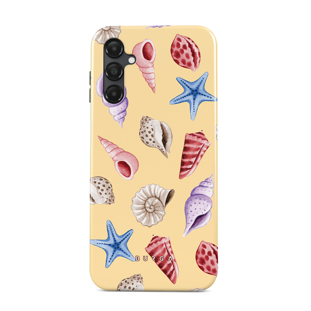 En este diseño: conchas, estrellas de mar, fondo amarillo pastel, tema oceánico.
