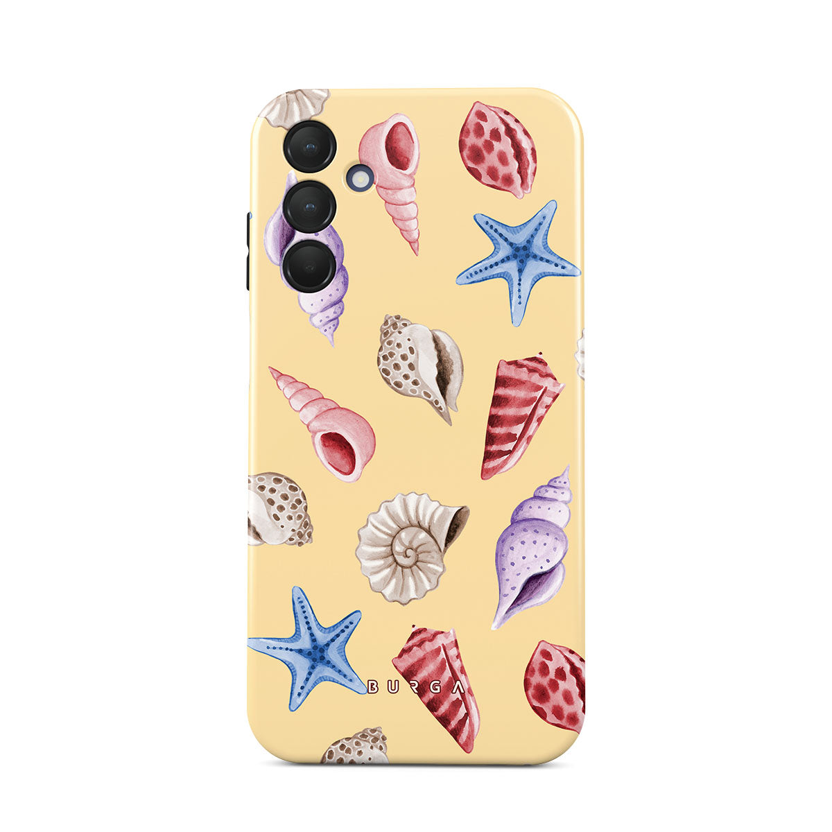 En este diseño: conchas, estrellas de mar, fondo amarillo pastel, tema oceánico.