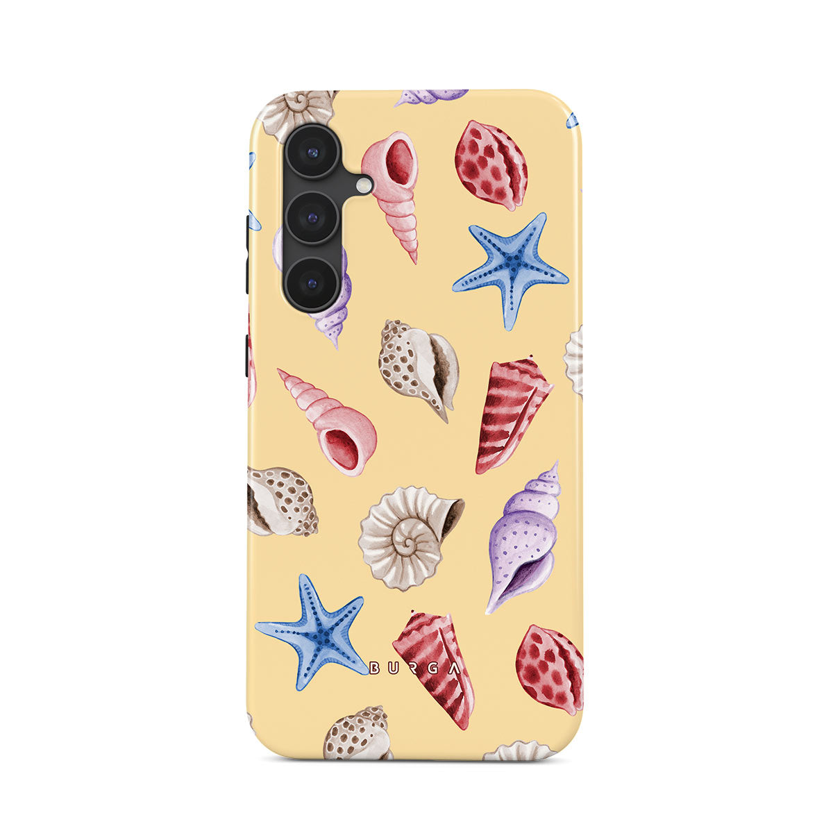 En este diseño: conchas, estrellas de mar, fondo amarillo pastel, tema oceánico.