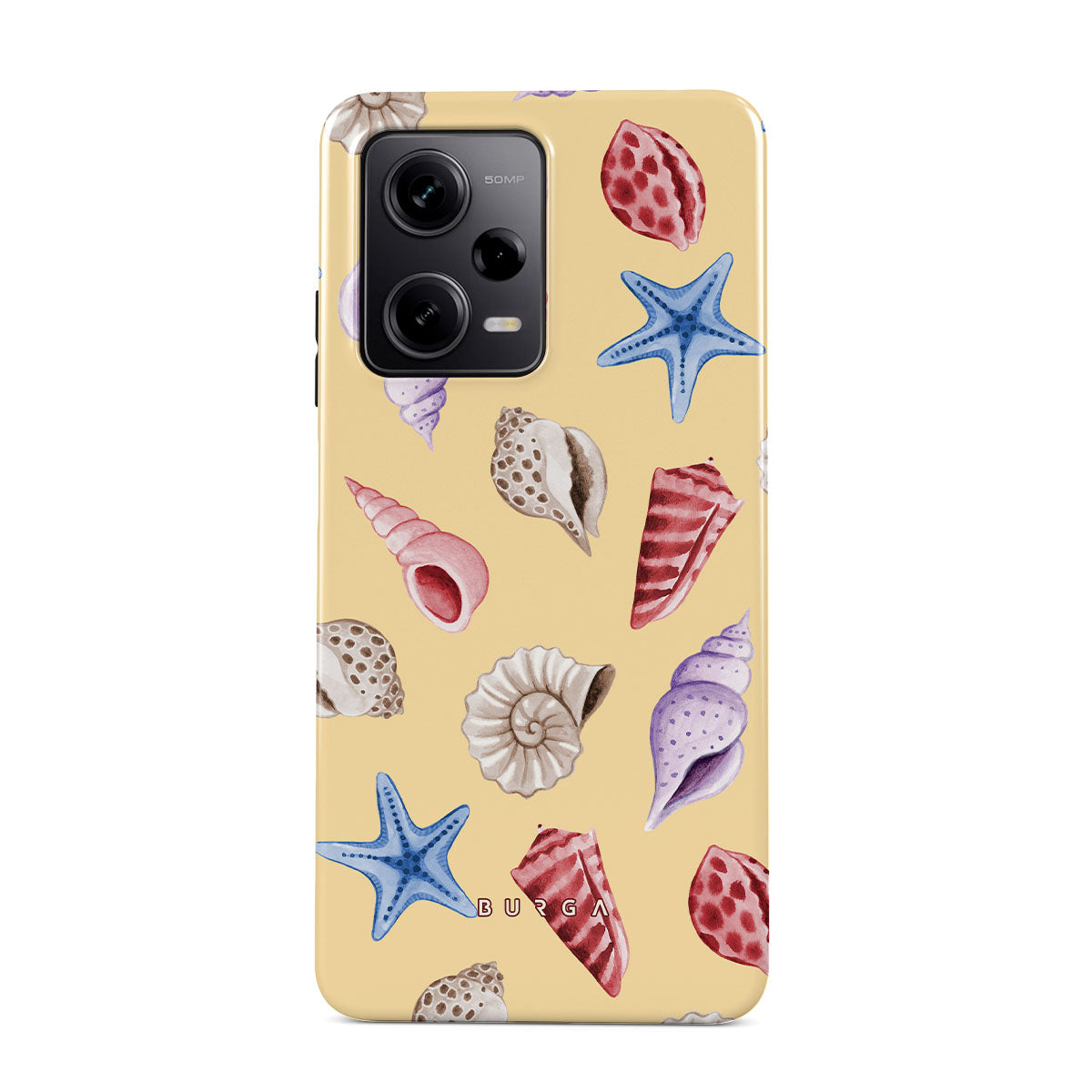 En este diseño: conchas, estrellas de mar, fondo amarillo pastel, tema oceánico.