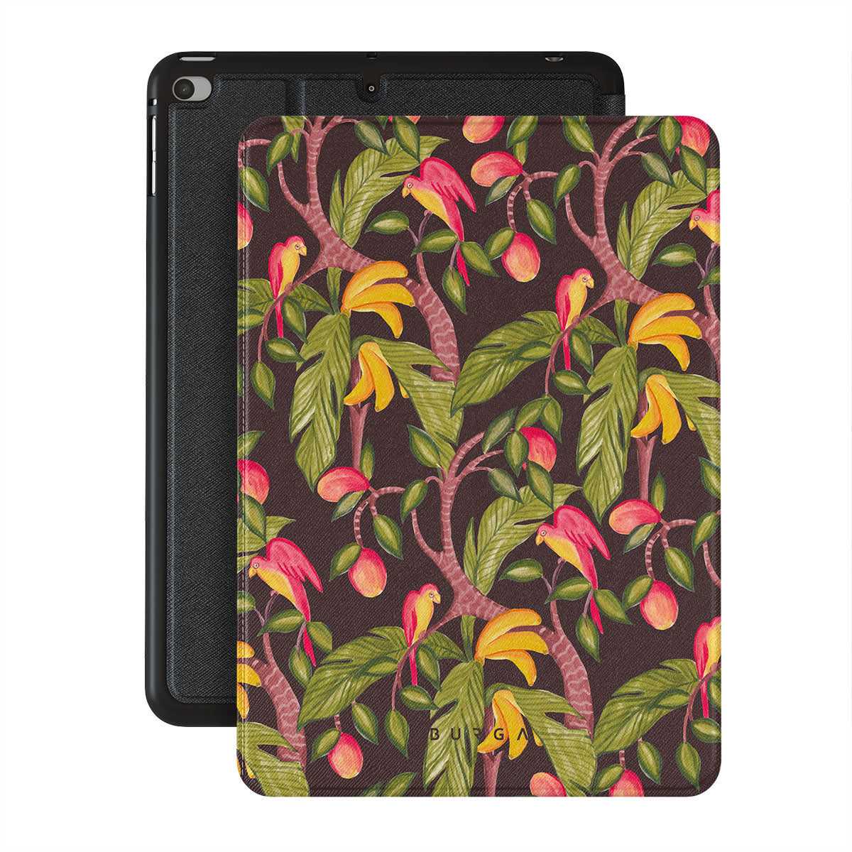 En este diseño: mangos, hojas verdes oscuras, patrón inspirado en la jungla