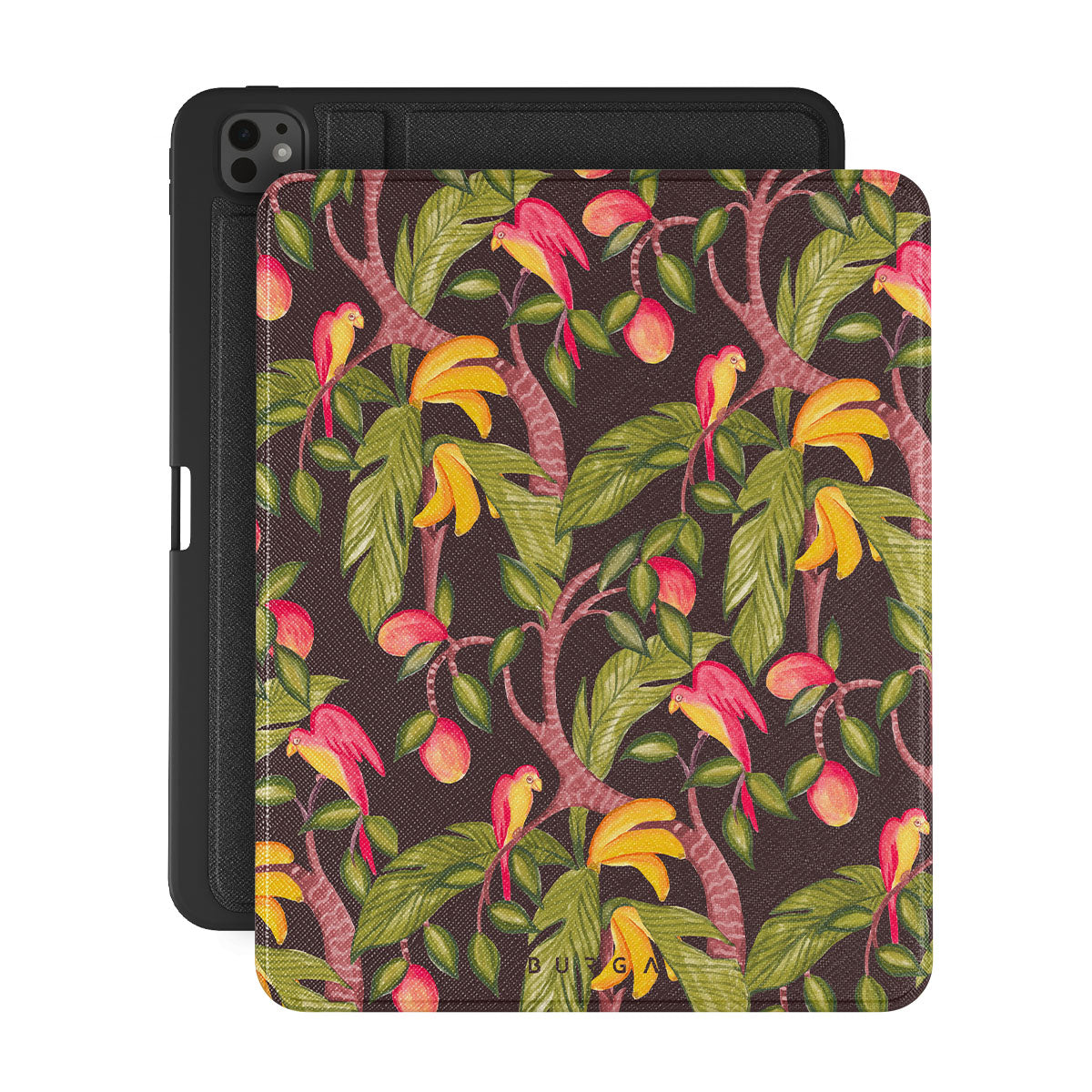 En este diseño: mangos, hojas verdes oscuras, patrón inspirado en la jungla