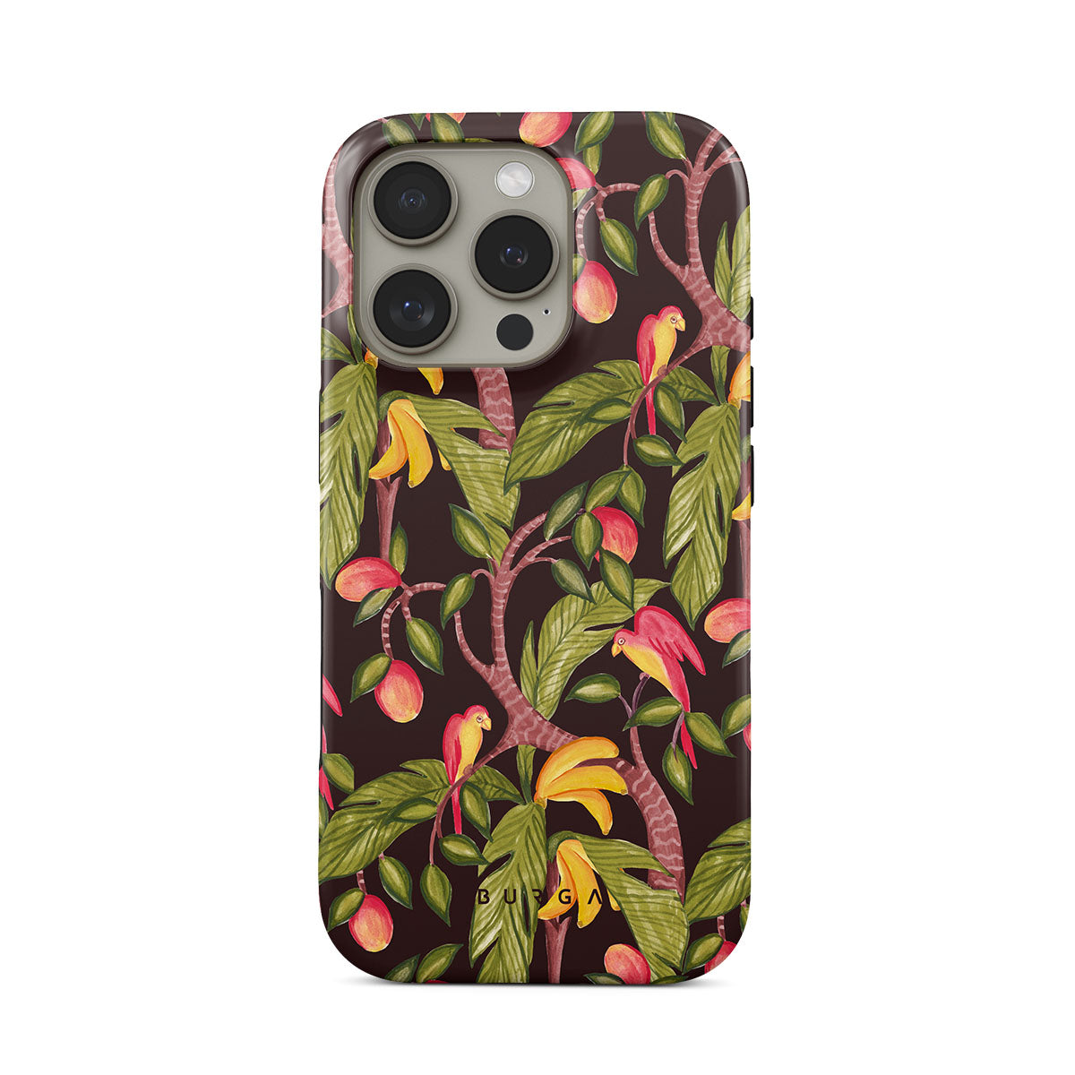 En este diseño: mangos, hojas verdes oscuras, patrón inspirado en la jungla
