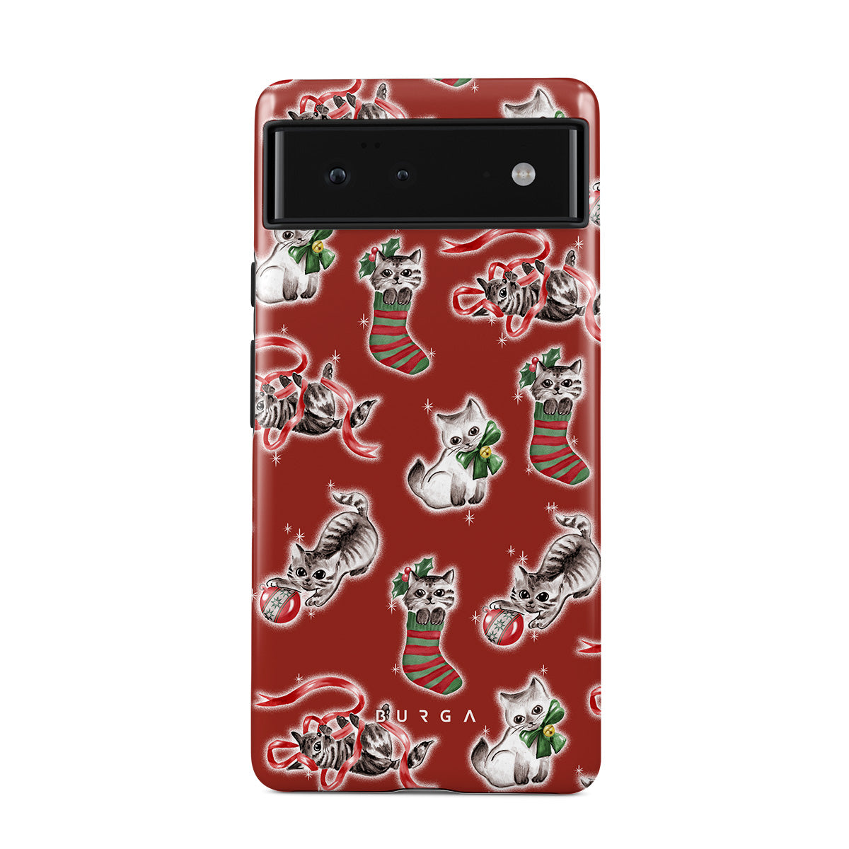 En este diseño: gatos, medias navideñas, gatitos, patrón rojo y verde, gatos juguetones, adornos navideños