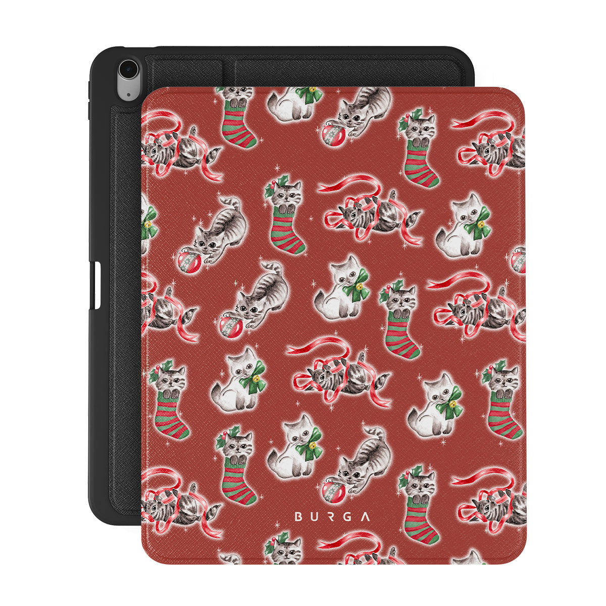 En este diseño: gatos, medias navideñas, gatitos, patrón rojo y verde, gatos juguetones, adornos navideños