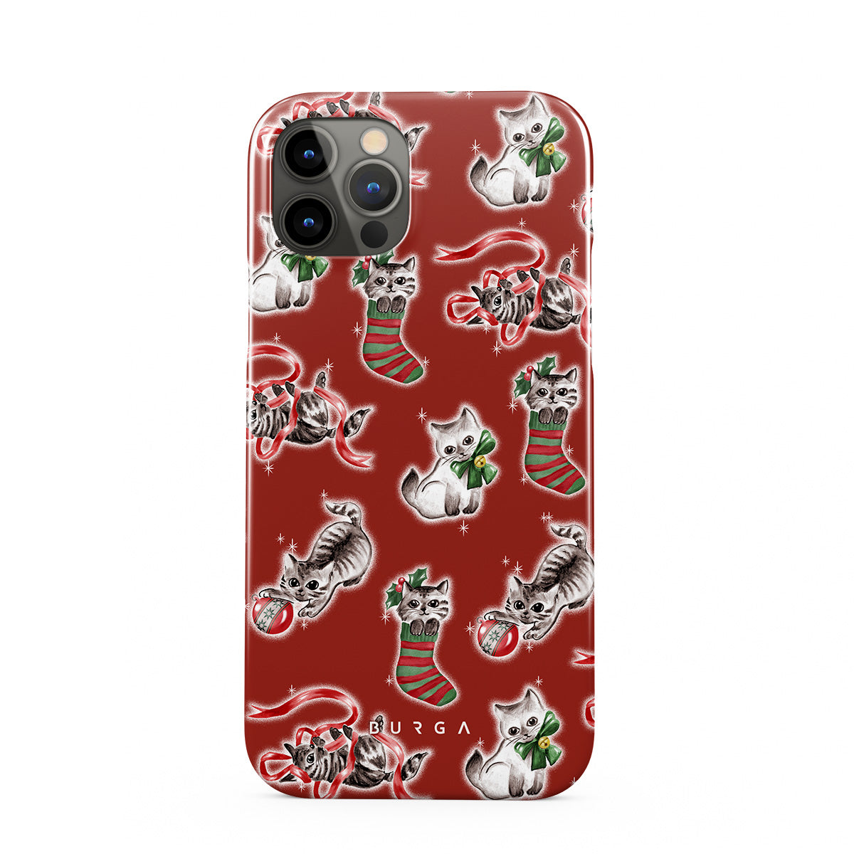 En este diseño: gatos, medias navideñas, gatitos, patrón rojo y verde, gatos juguetones, adornos navideños