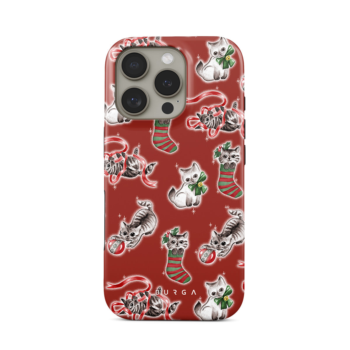 En este diseño: gatos, medias navideñas, gatitos, patrón rojo y verde, gatos juguetones, adornos navideños