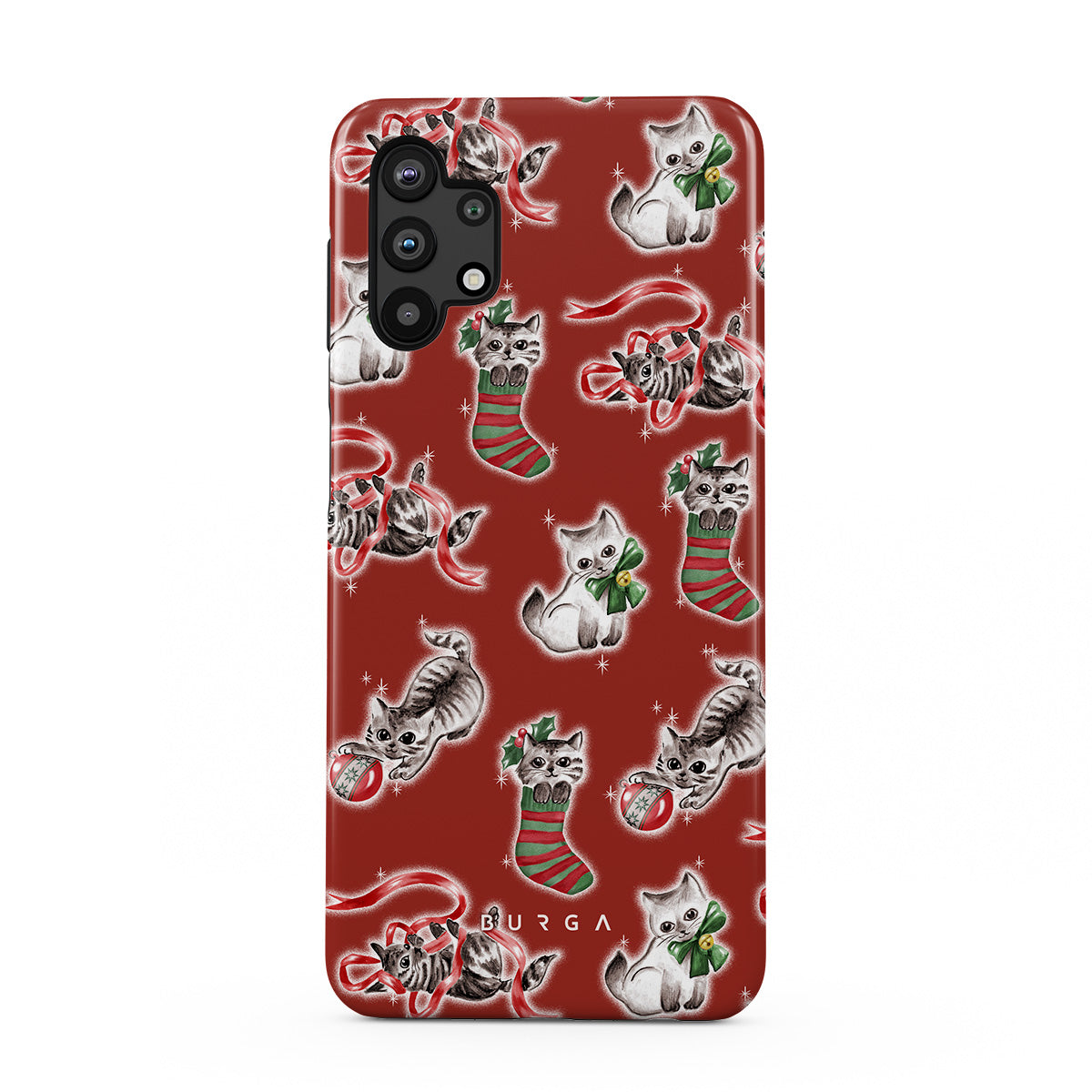 En este diseño: gatos, medias navideñas, gatitos, patrón rojo y verde, gatos juguetones, adornos navideños