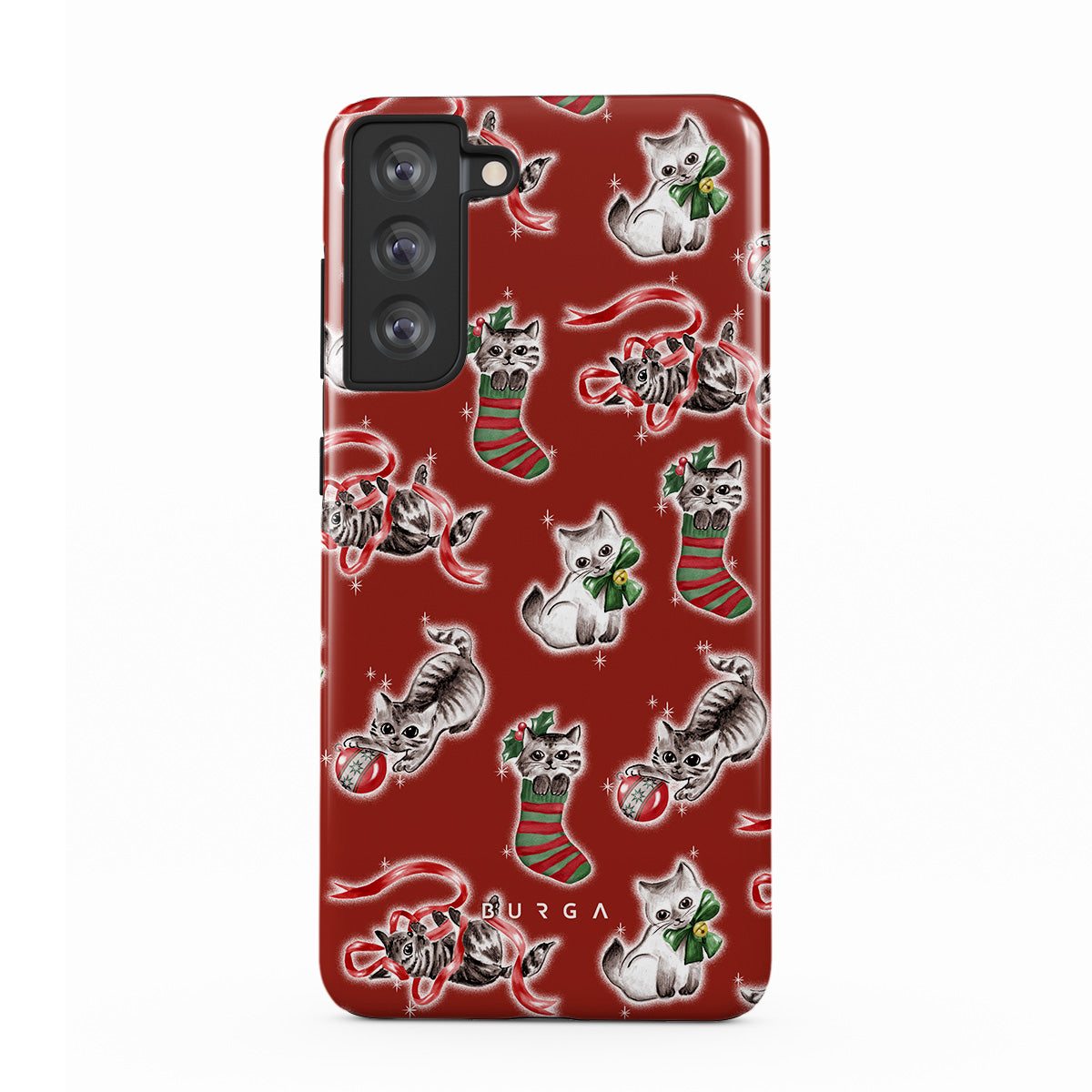 En este diseño: gatos, medias navideñas, gatitos, patrón rojo y verde, gatos juguetones, adornos navideños