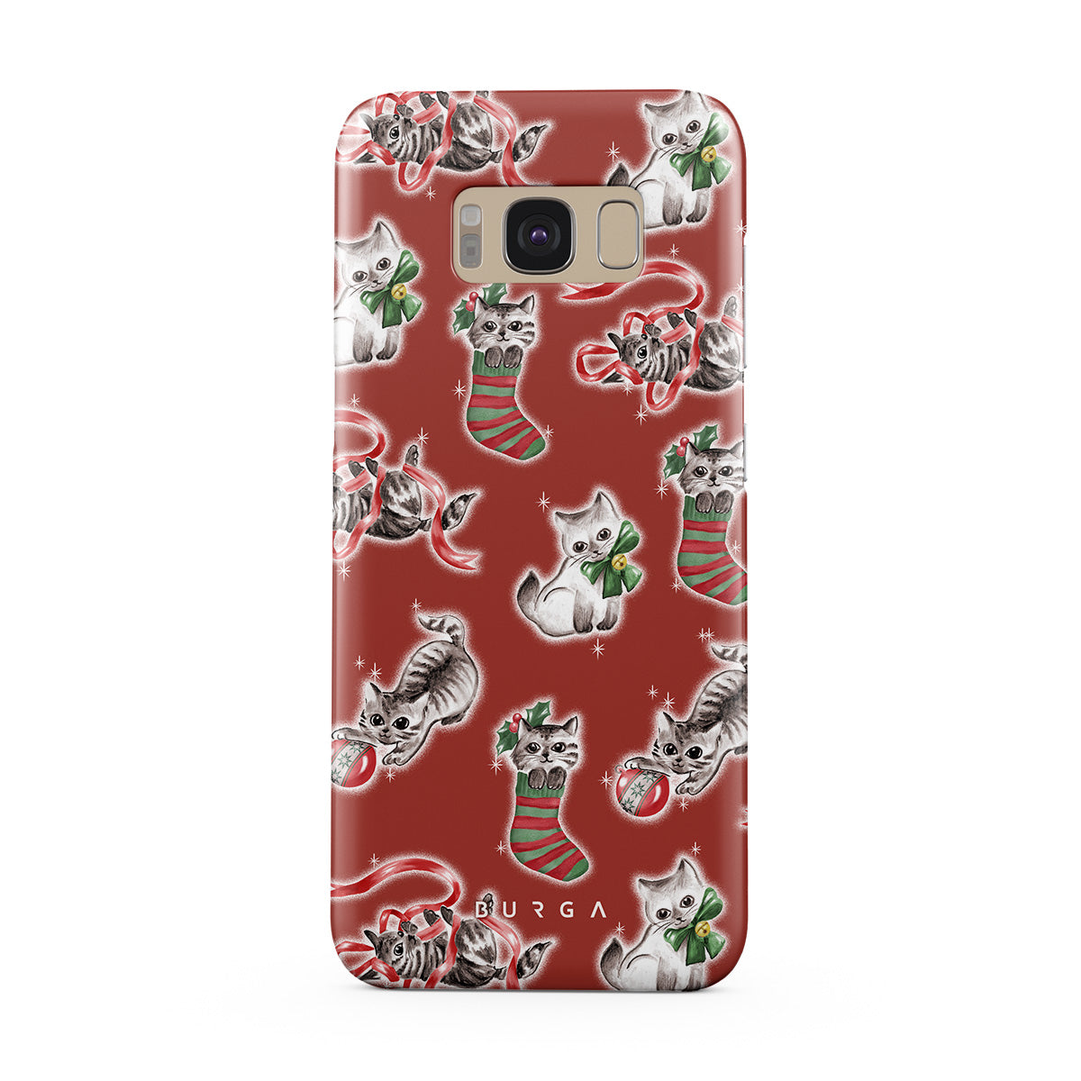 En este diseño: gatos, medias navideñas, gatitos, patrón rojo y verde, gatos juguetones, adornos navideños