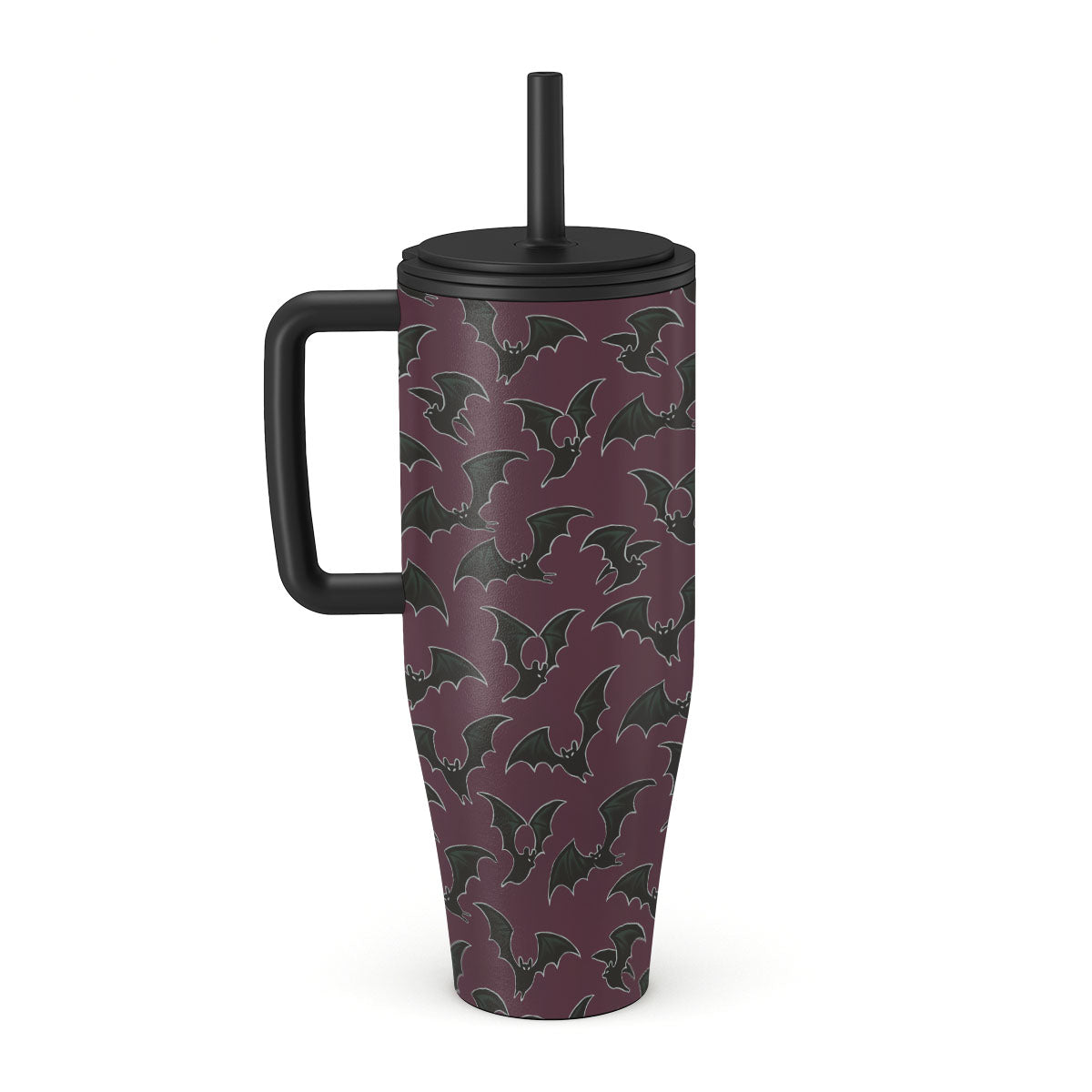 En este diseño: tema de Halloween, murciélagos, fondo burdeos