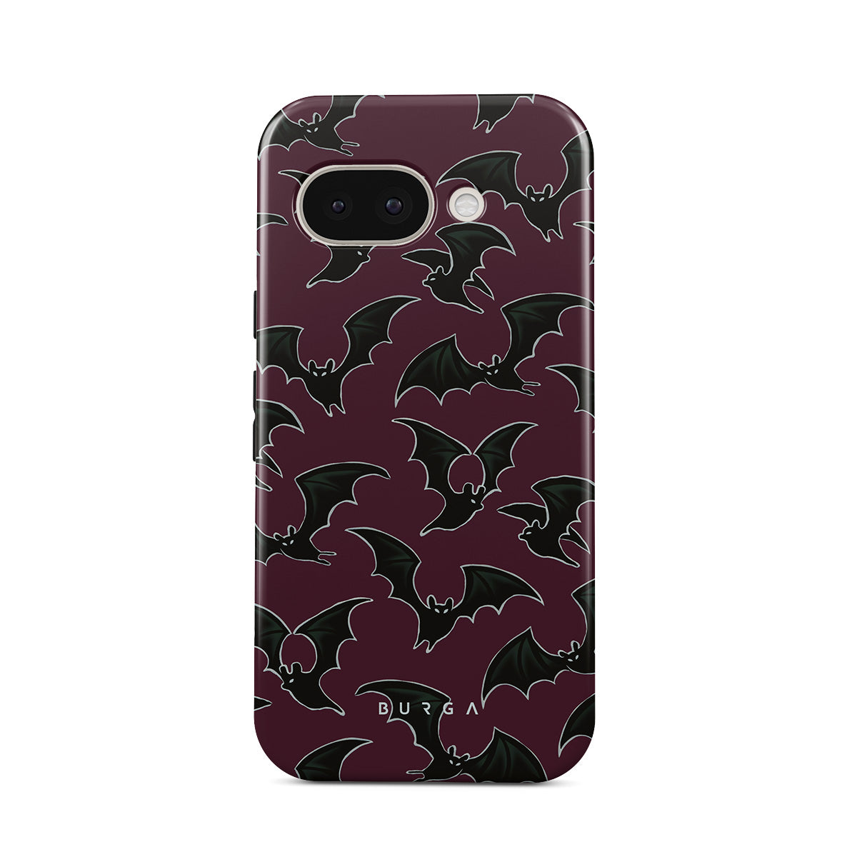 En este diseño: tema de Halloween, murciélagos, fondo burdeos