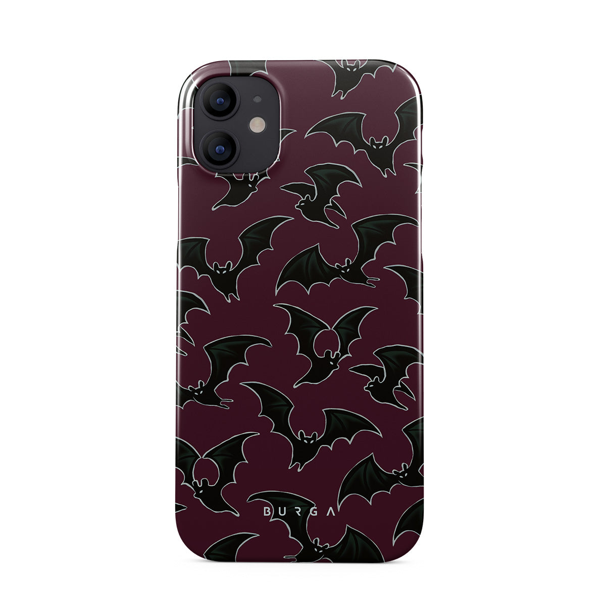 En este diseño: tema de Halloween, murciélagos, fondo burdeos