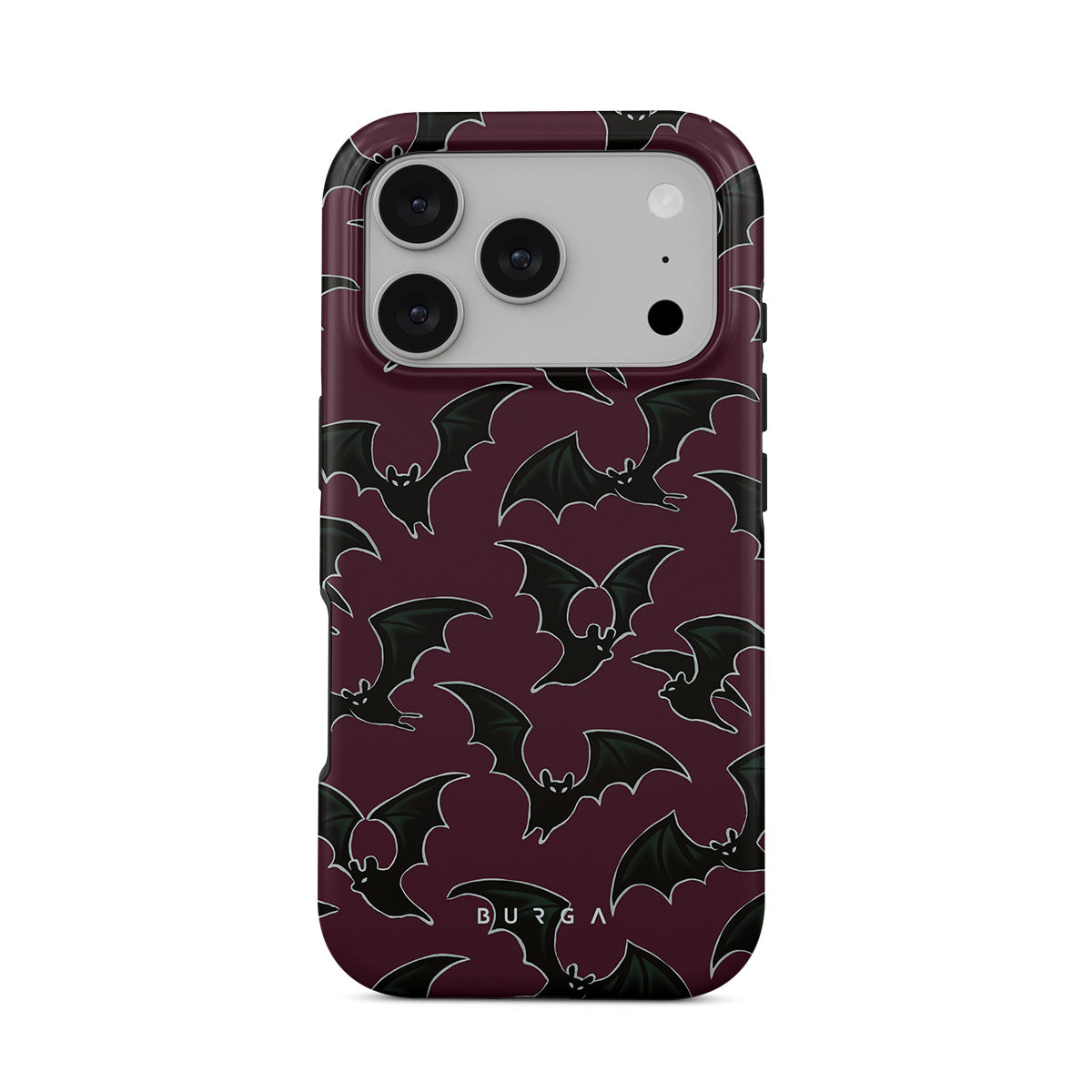 En este diseño: tema de Halloween, murciélagos, fondo burdeos