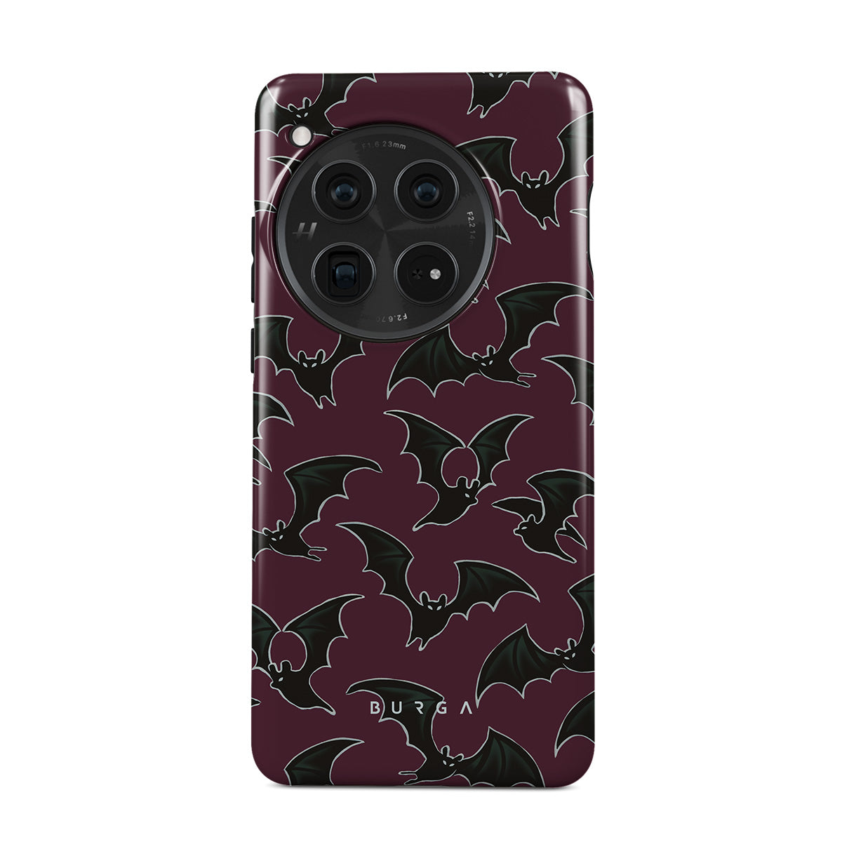 En este diseño: tema de Halloween, murciélagos, fondo burdeos