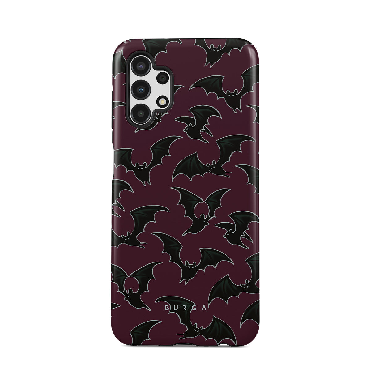 En este diseño: tema de Halloween, murciélagos, fondo burdeos