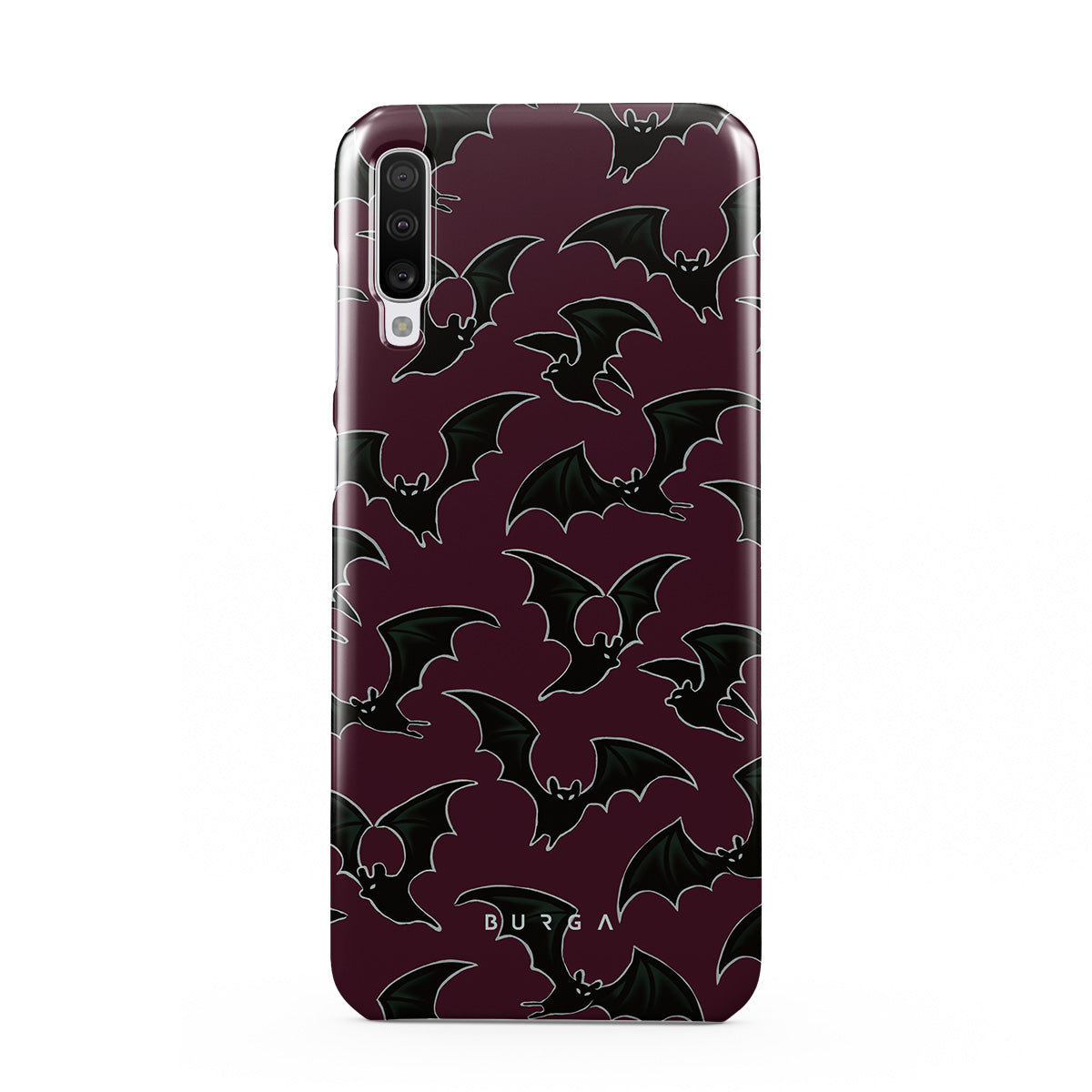 En este diseño: tema de Halloween, murciélagos, fondo burdeos