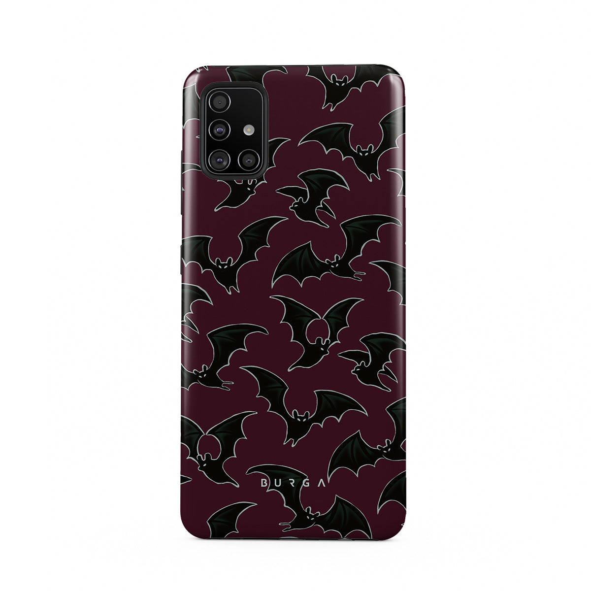 En este diseño: tema de Halloween, murciélagos, fondo burdeos
