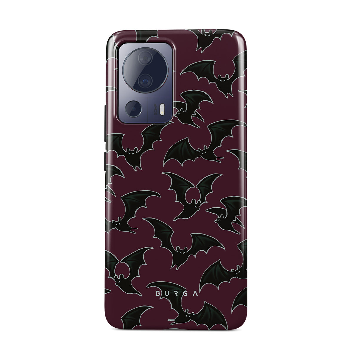 En este diseño: tema de Halloween, murciélagos, fondo burdeos