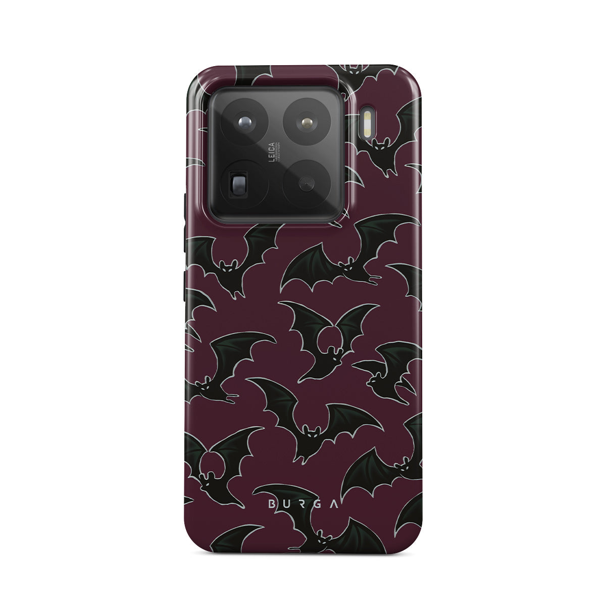 En este diseño: tema de Halloween, murciélagos, fondo burdeos