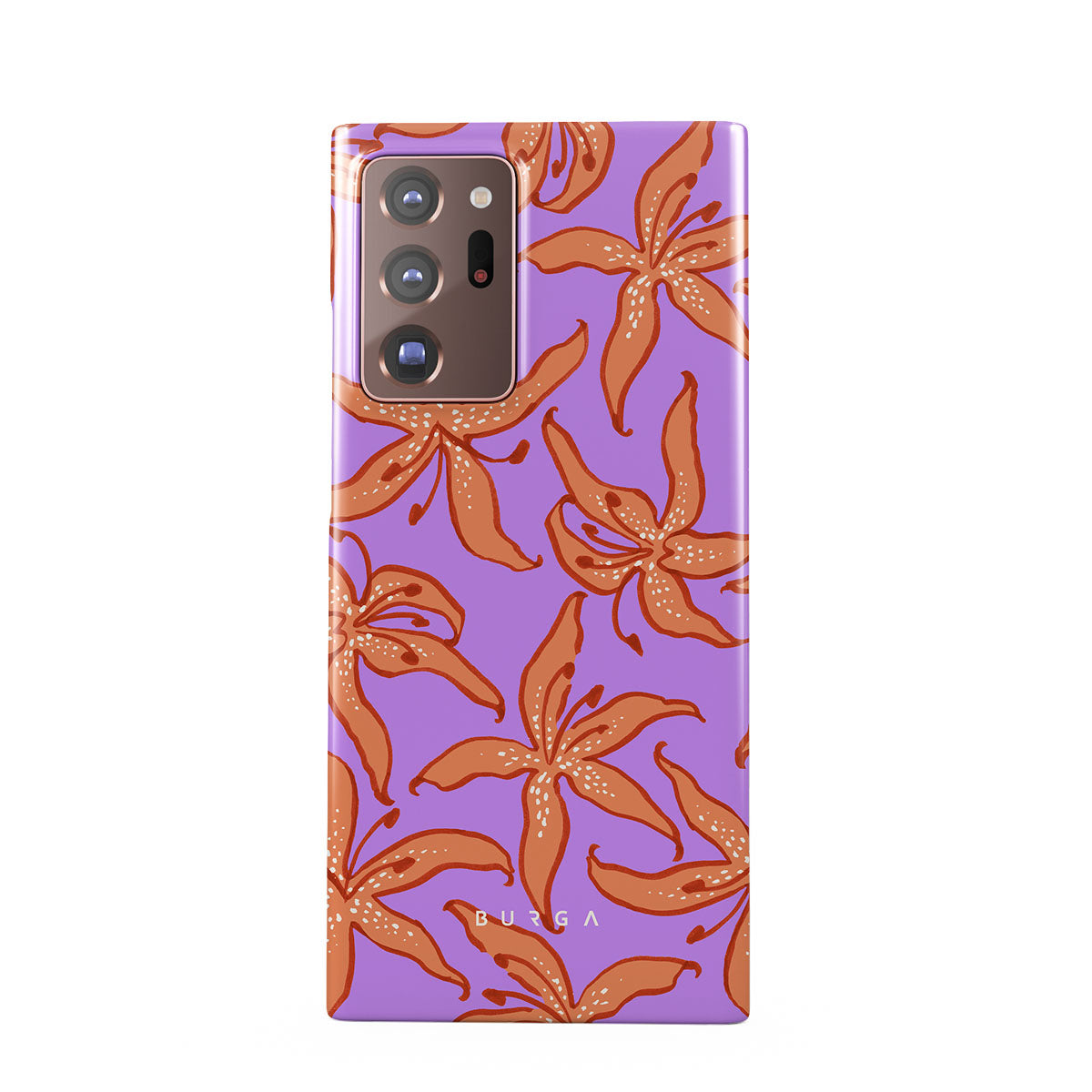 En este diseño: lirios naranjas, fondo morado.