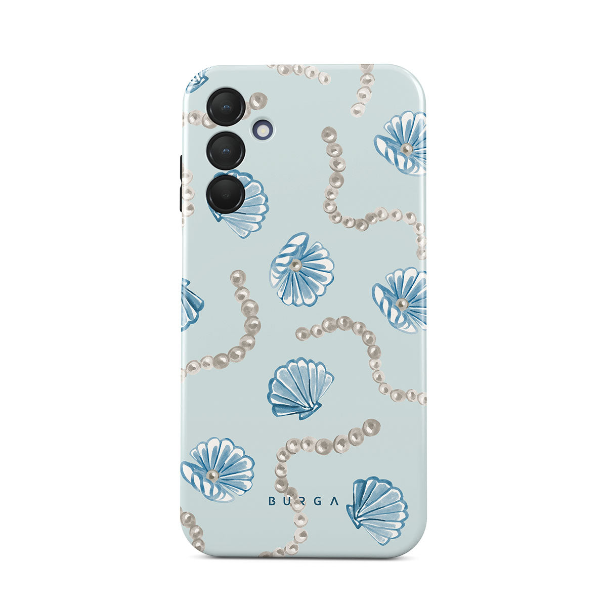 En este diseño: perlas, conchas, fondo azul claro, elementos del mar.