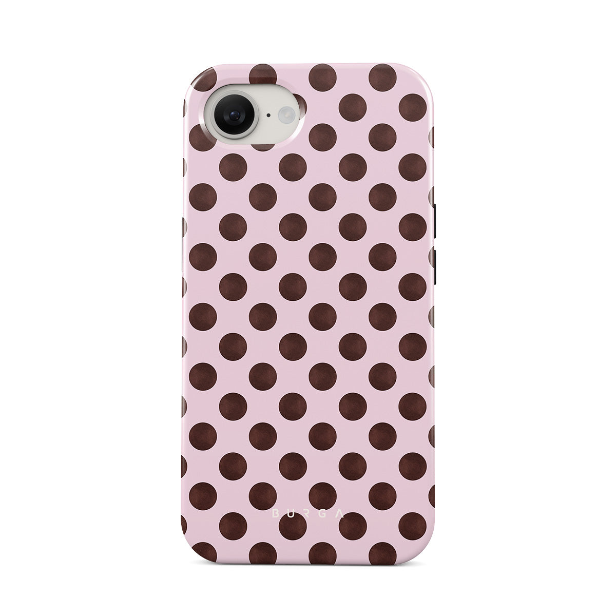 En este diseño: patrón retro de lunares, fondo rosa, lunares marrones