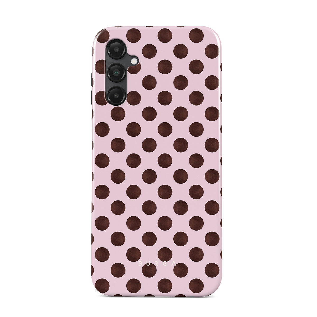 En este diseño: patrón retro de lunares, fondo rosa, lunares marrones