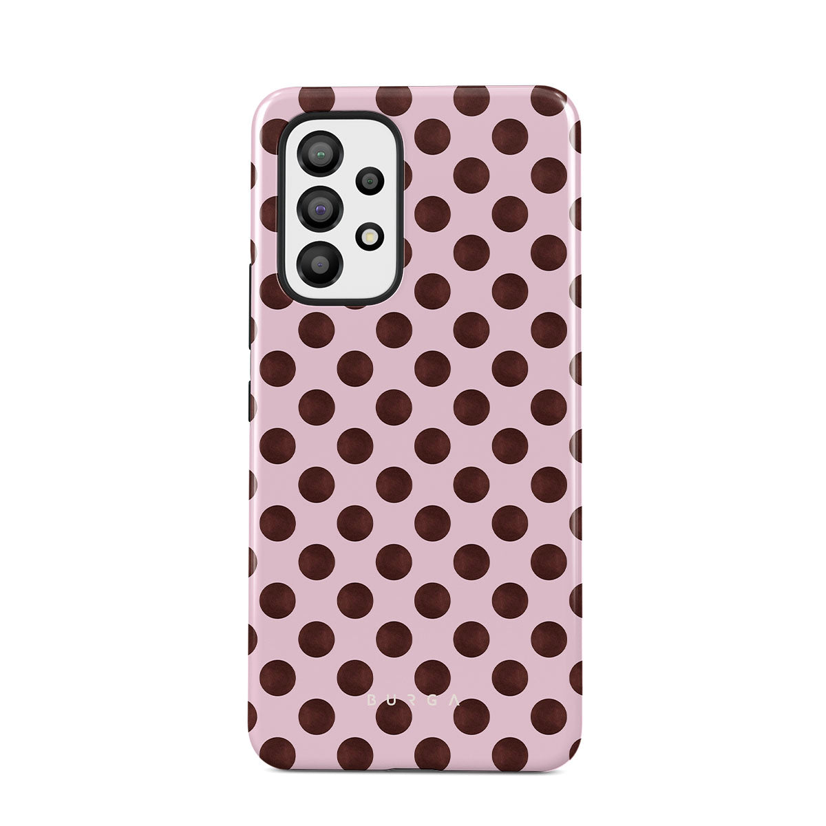En este diseño: patrón retro de lunares, fondo rosa, lunares marrones