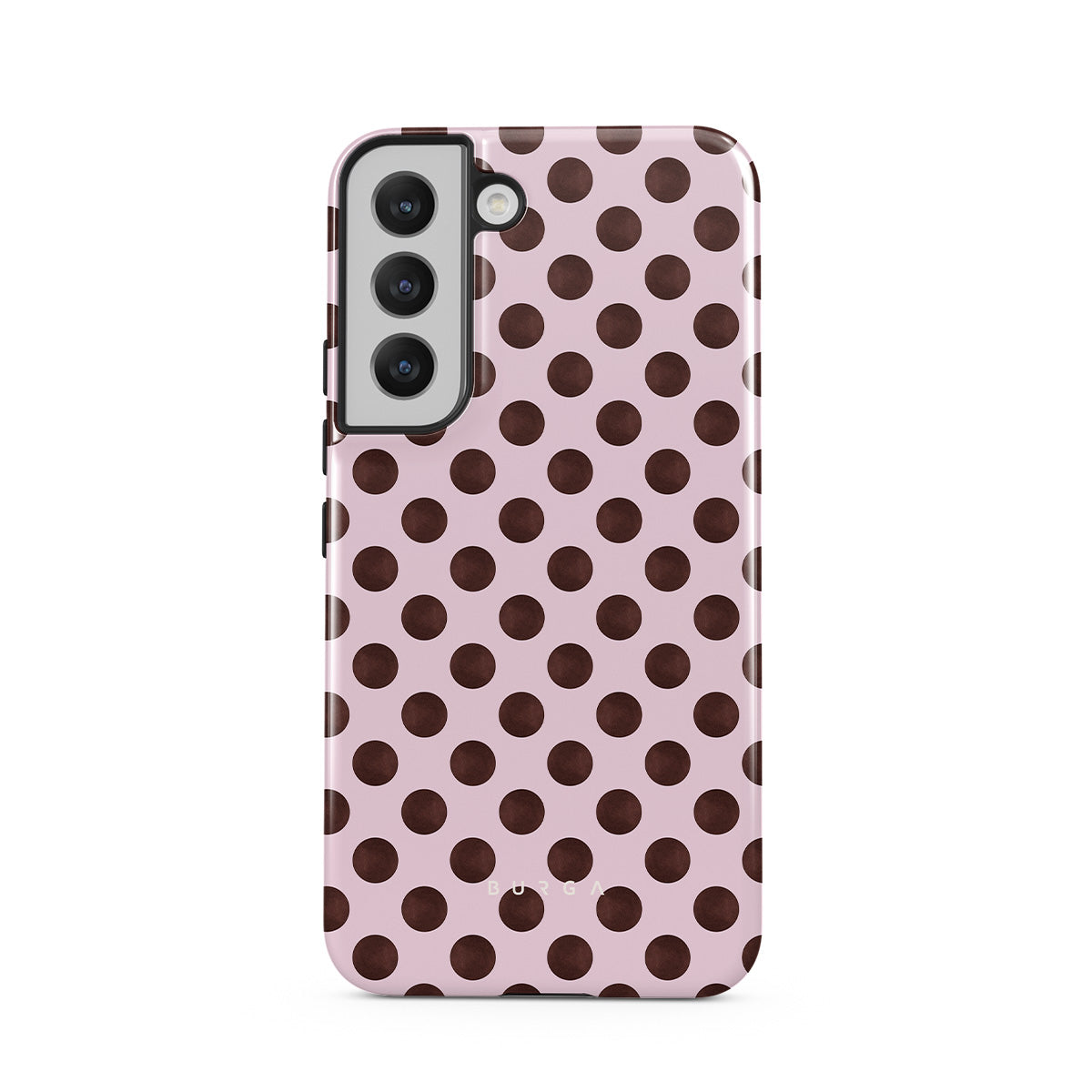 En este diseño: patrón retro de lunares, fondo rosa, lunares marrones