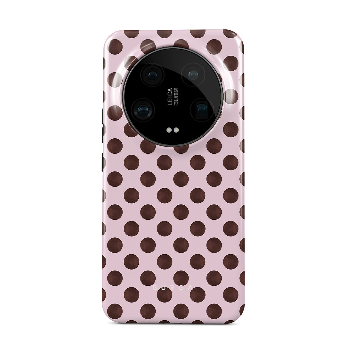 En este diseño: patrón retro de lunares, fondo rosa, lunares marrones