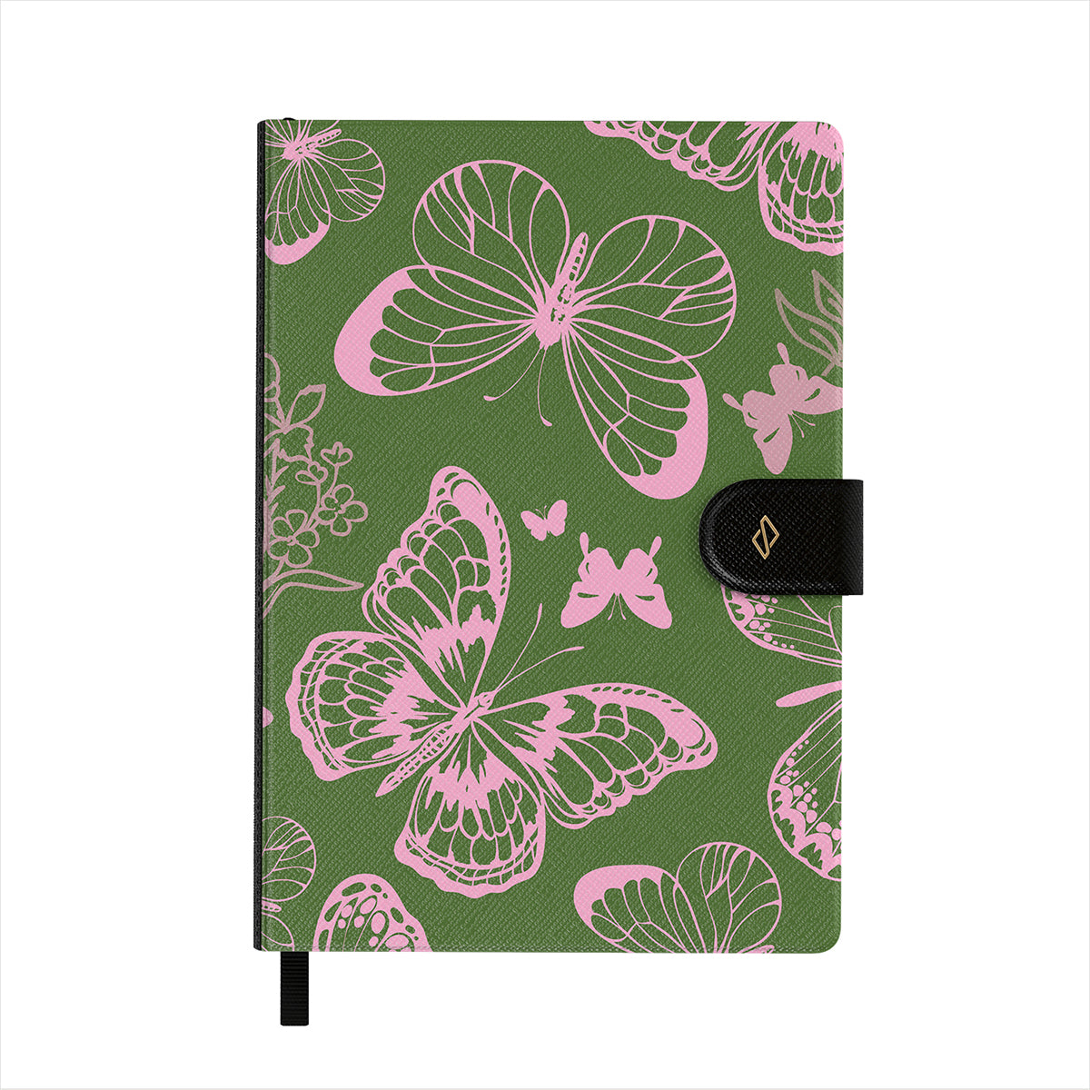 La portada está decorada con los diseños de BURGA impresos en piel sintética vegana. Incluye una elegante cinta negra marcapáginas.