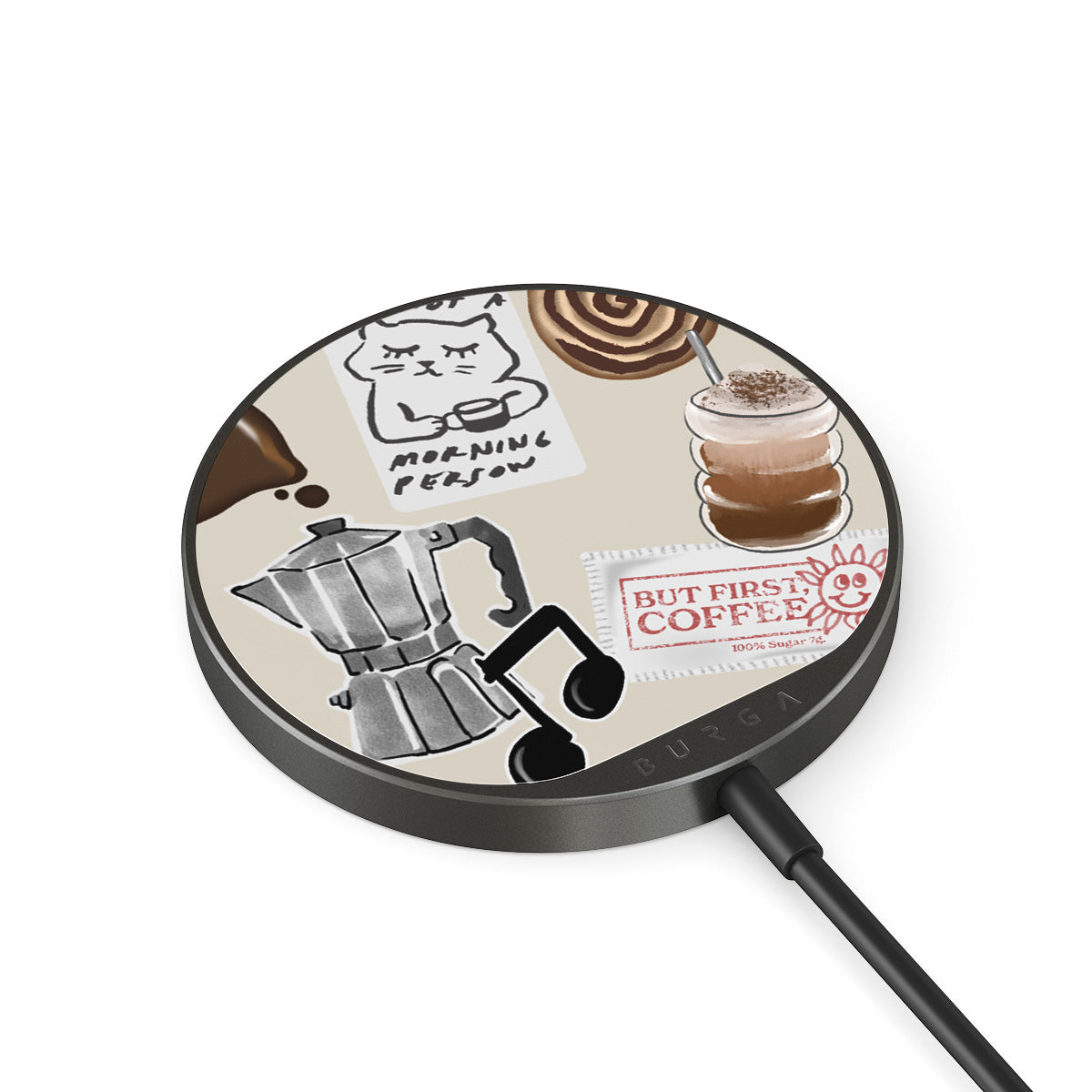 En este diseño: cafetera moka, frappé, rollo de canela, corazón de chocolate, sticker "Not a morning person", ticket "But First, Coffee", nota musical