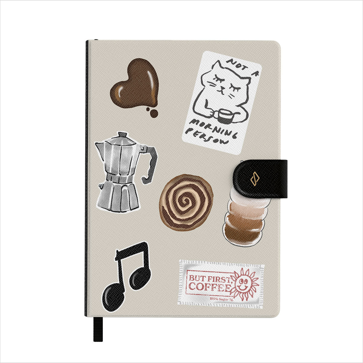 En este diseño: cafetera moka, frappé, rollo de canela, corazón de chocolate, sticker "Not a morning person", ticket "But First, Coffee", nota musical.