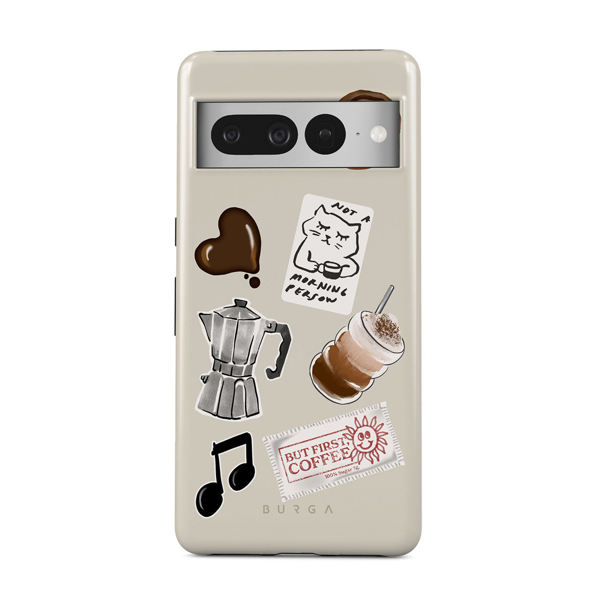 En este diseño: cafetera moka, frappé, rollo de canela, corazón de chocolate, sticker "Not a morning person", ticket "But First, Coffee", nota musical.