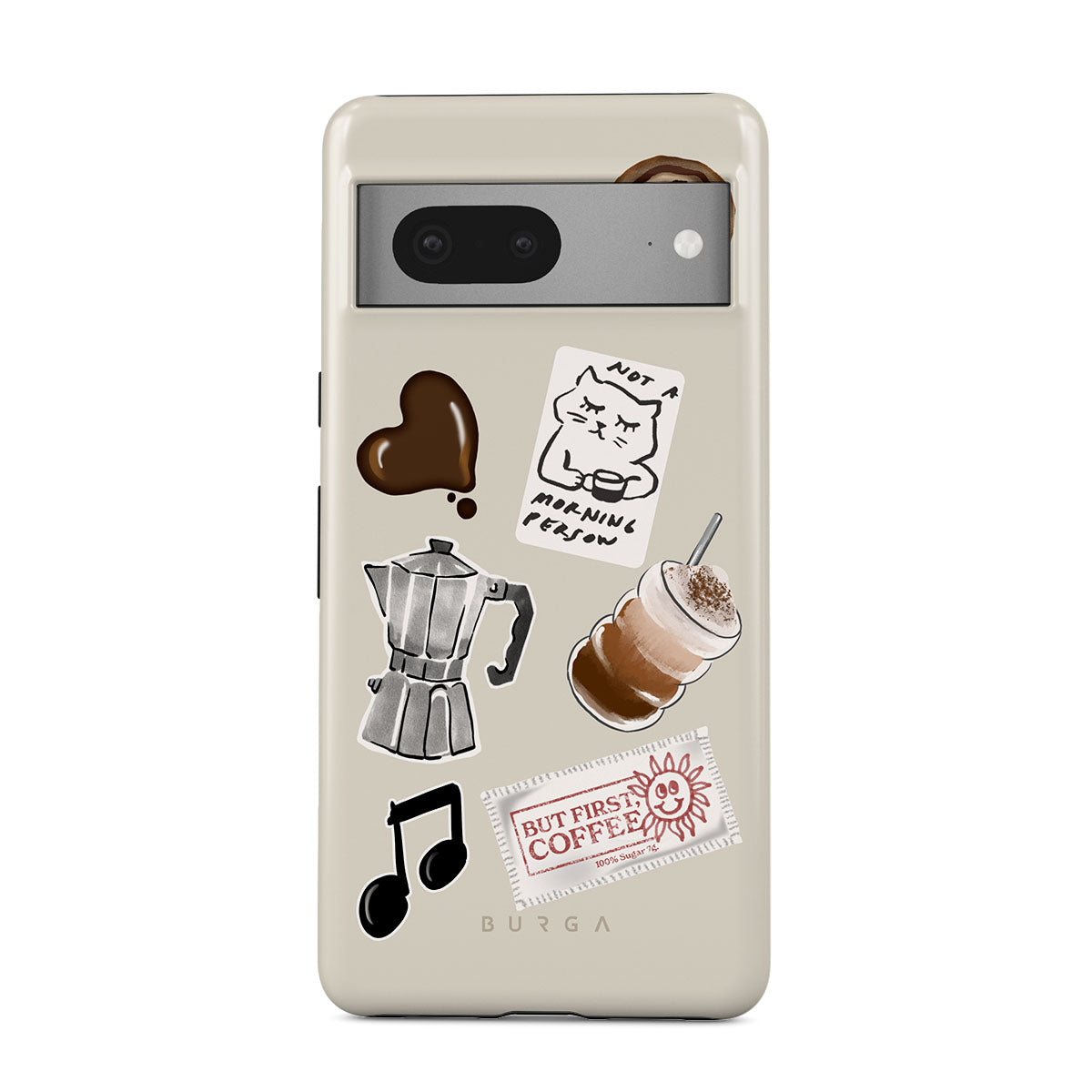 En este diseño: cafetera moka, frappé, rollo de canela, corazón de chocolate, sticker "Not a morning person", ticket "But First, Coffee", nota musical.