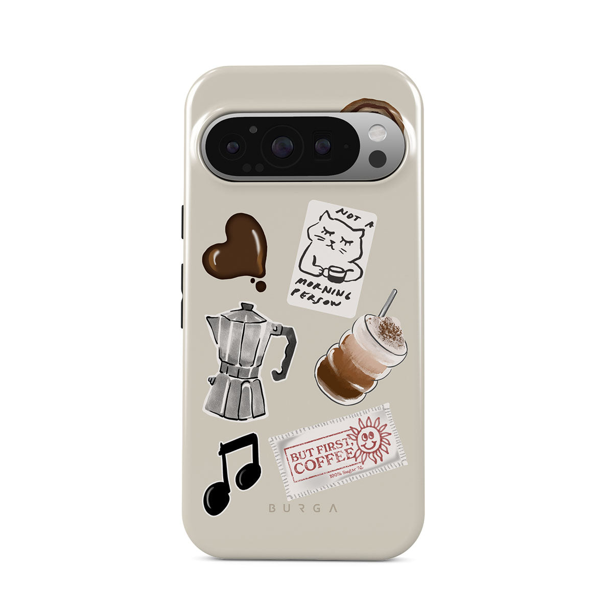 En este diseño: cafetera moka, frappé, rollo de canela, corazón de chocolate, sticker "Not a morning person", ticket "But First, Coffee", nota musical.