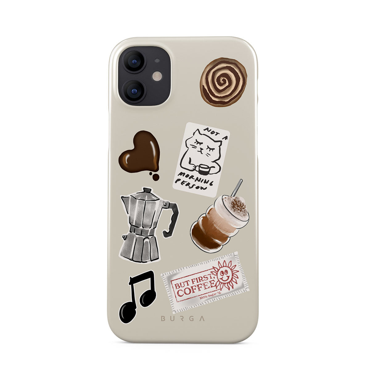 En este diseño: cafetera moka, frappé, rollo de canela, corazón de chocolate, sticker "Not a morning person", ticket "But First, Coffee", nota musical.