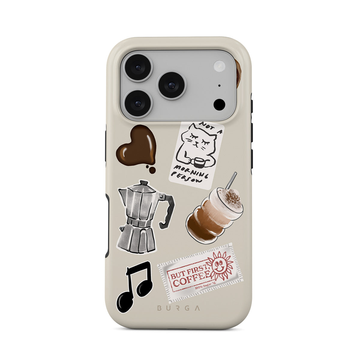 En este diseño: cafetera moka, frappé, rollo de canela, corazón de chocolate, sticker "Not a morning person", ticket "But First, Coffee", nota musical.