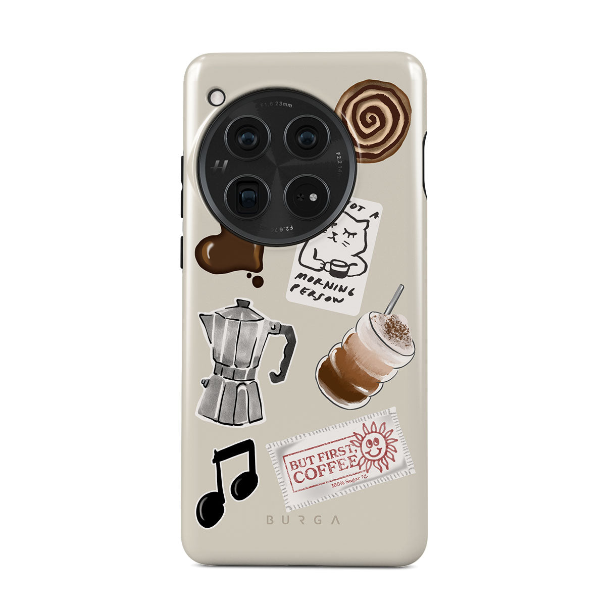 En este diseño: cafetera moka, frappé, rollo de canela, corazón de chocolate, sticker "Not a morning person", ticket "But First, Coffee", nota musical.