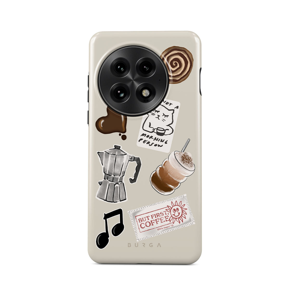 En este diseño: cafetera moka, frappé, rollo de canela, corazón de chocolate, sticker "Not a morning person", ticket "But First, Coffee", nota musical.