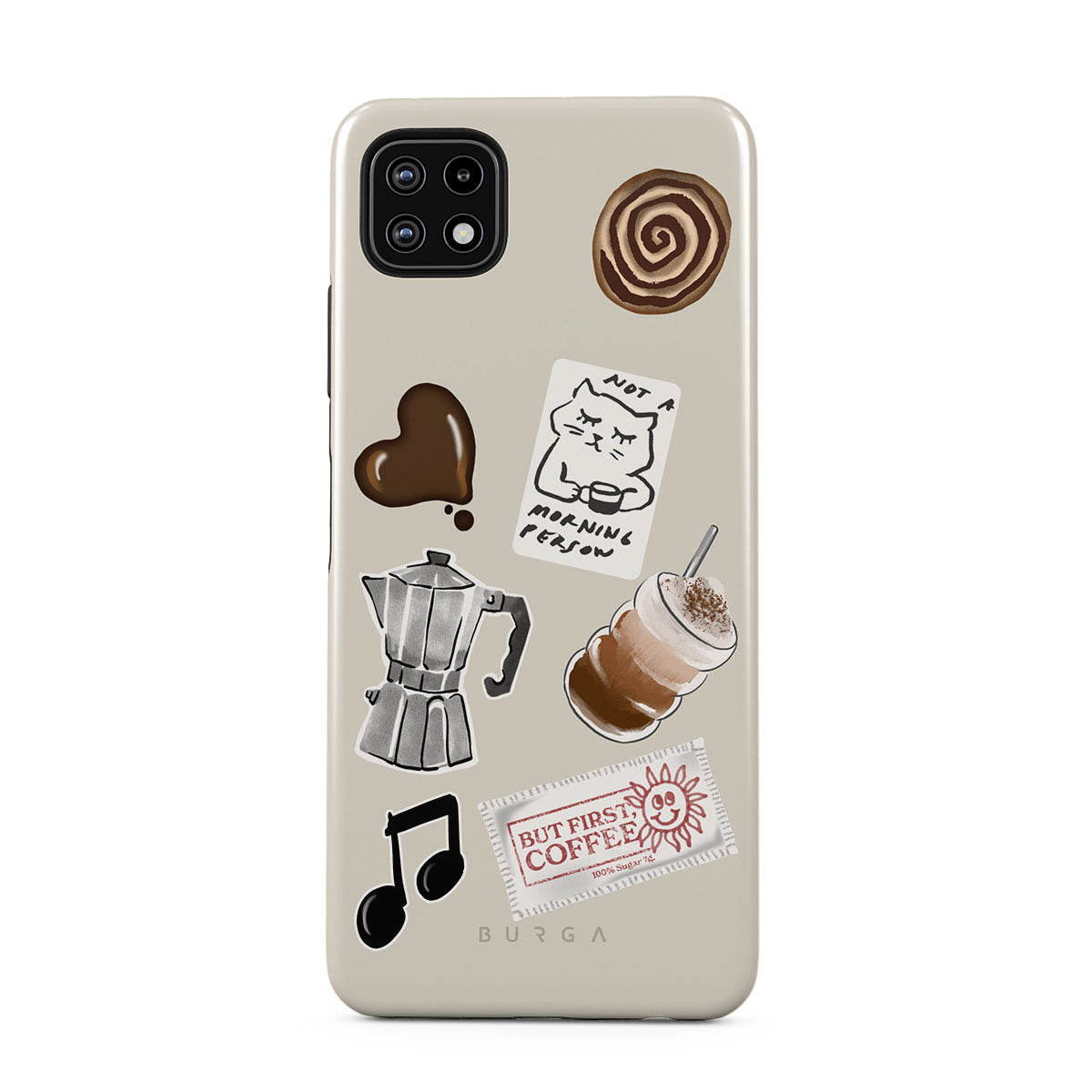 En este diseño: cafetera moka, frappé, rollo de canela, corazón de chocolate, sticker "Not a morning person", ticket "But First, Coffee", nota musical.