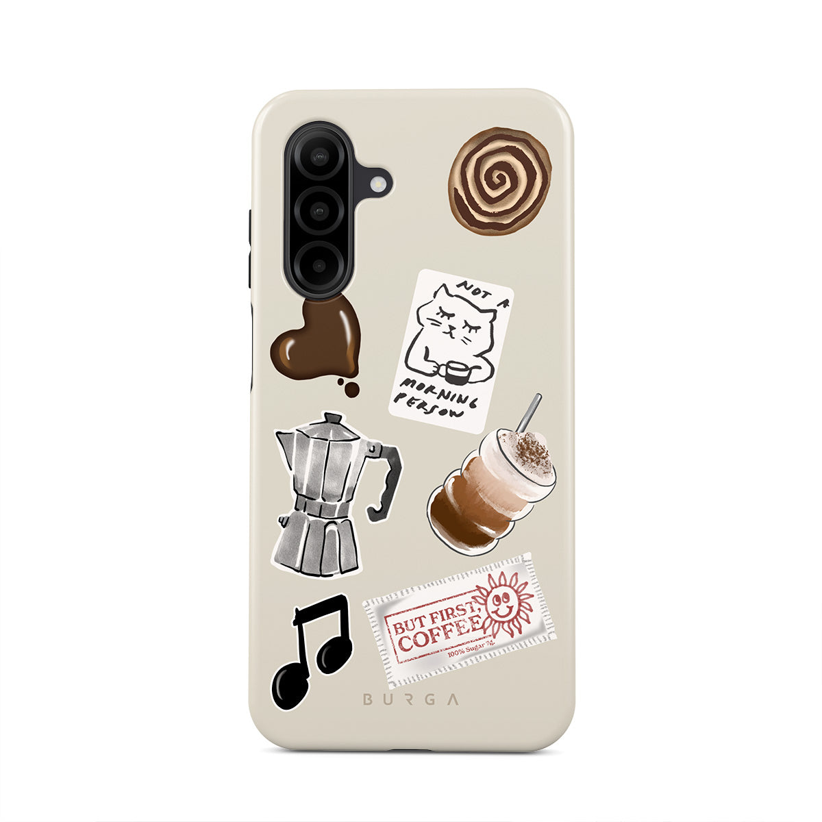 En este diseño: cafetera moka, frappé, rollo de canela, corazón de chocolate, sticker "Not a morning person", ticket "But First, Coffee", nota musical.