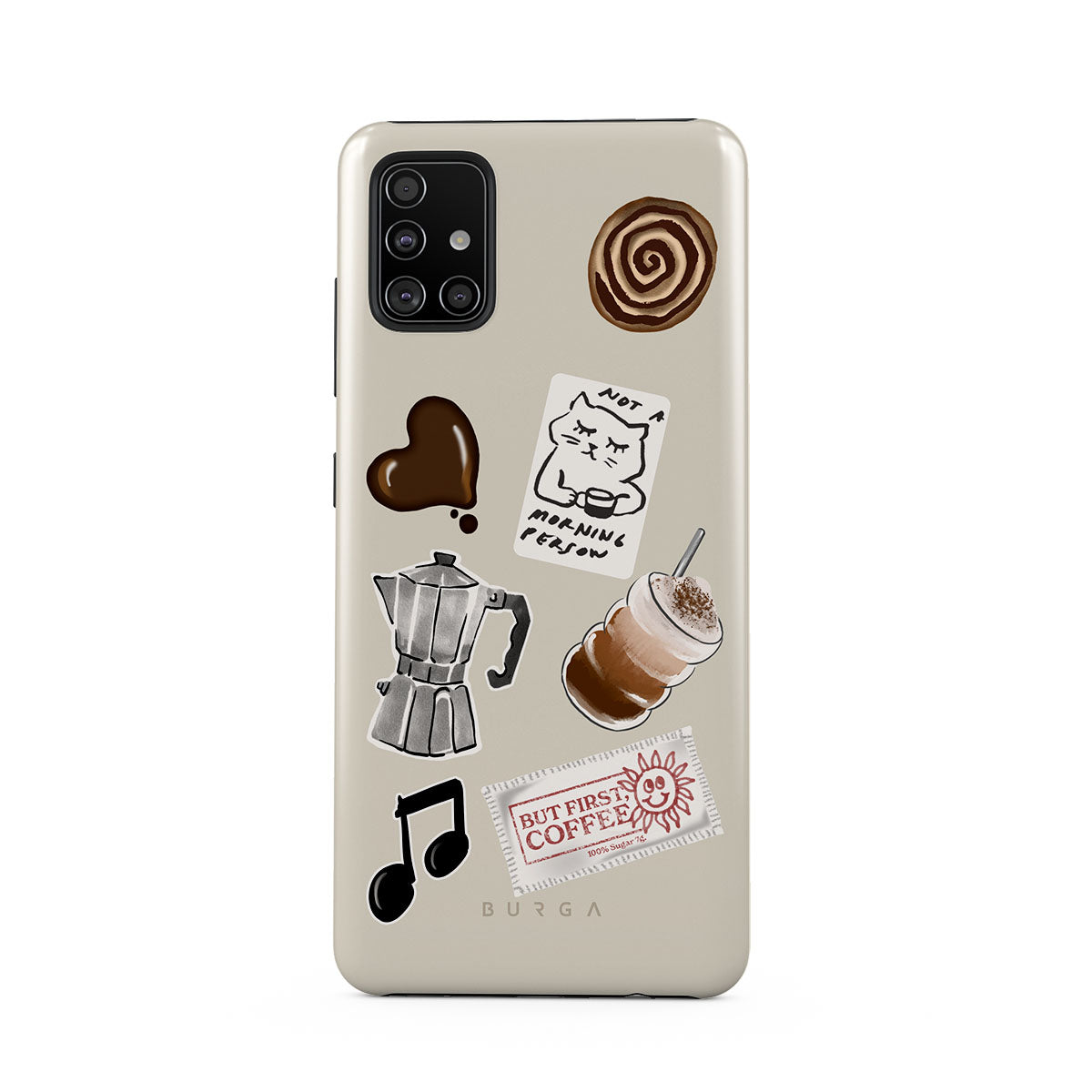 En este diseño: cafetera moka, frappé, rollo de canela, corazón de chocolate, sticker "Not a morning person", ticket "But First, Coffee", nota musical.