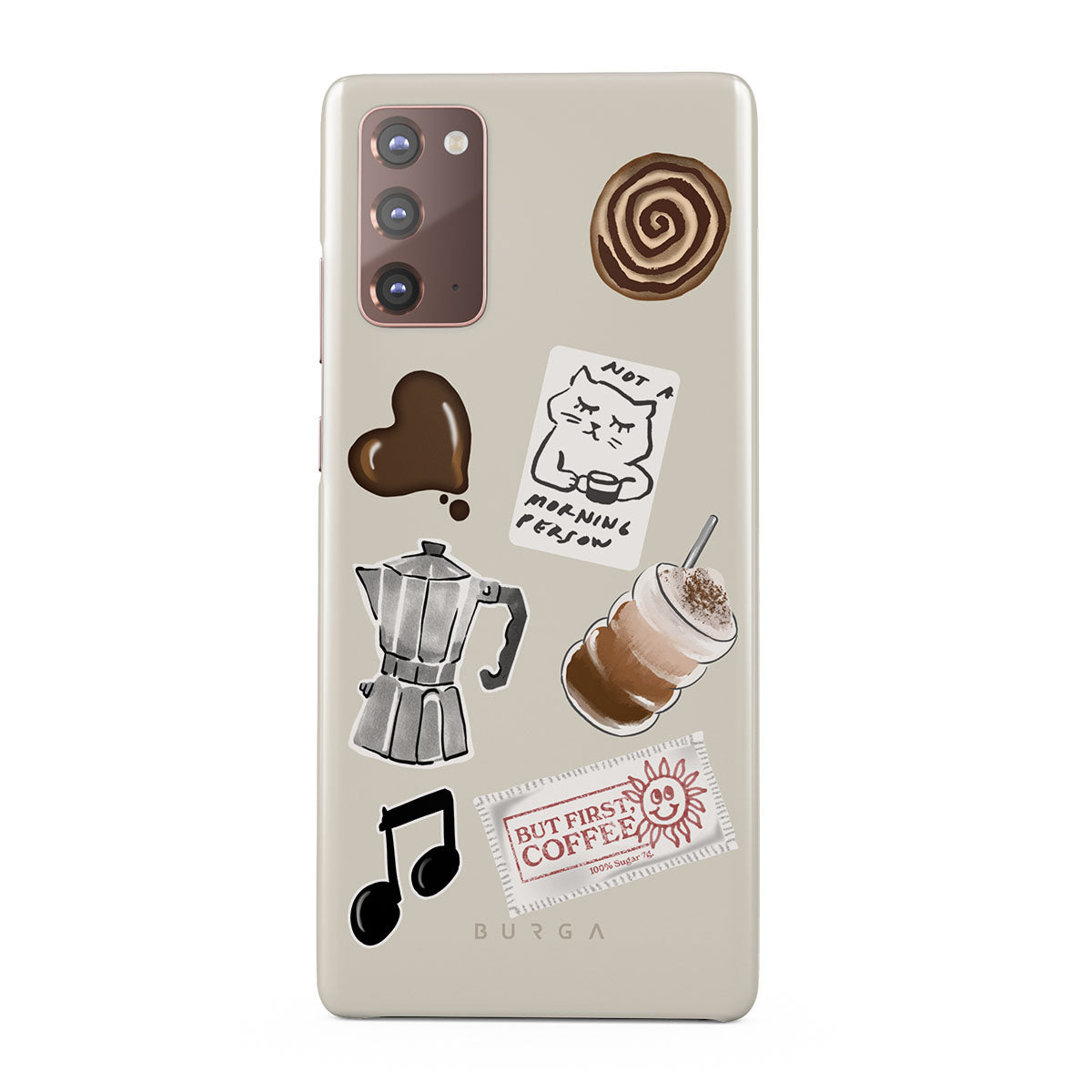 En este diseño: cafetera moka, frappé, rollo de canela, corazón de chocolate, sticker "Not a morning person", ticket "But First, Coffee", nota musical.
