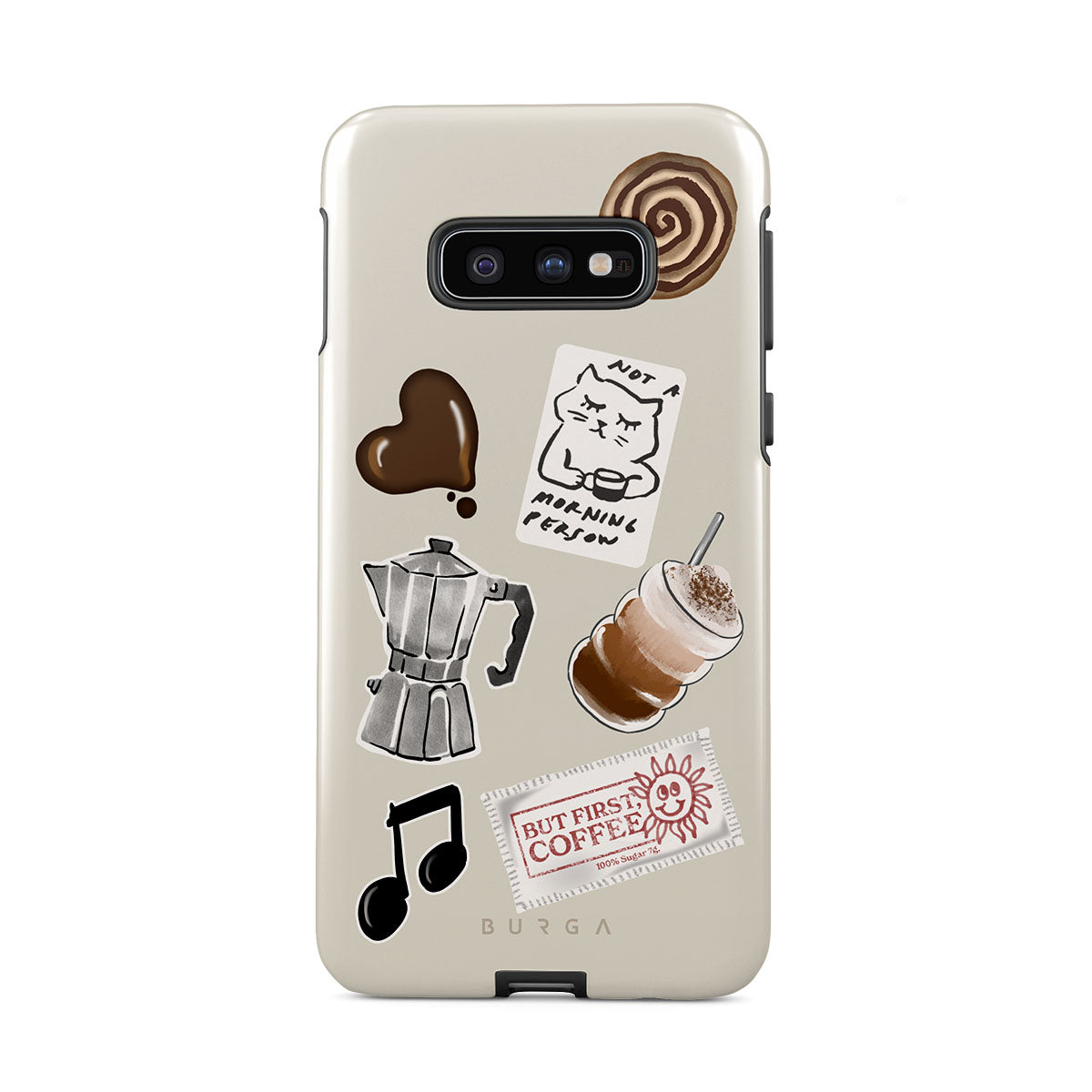 En este diseño: cafetera moka, frappé, rollo de canela, corazón de chocolate, sticker "Not a morning person", ticket "But First, Coffee", nota musical.