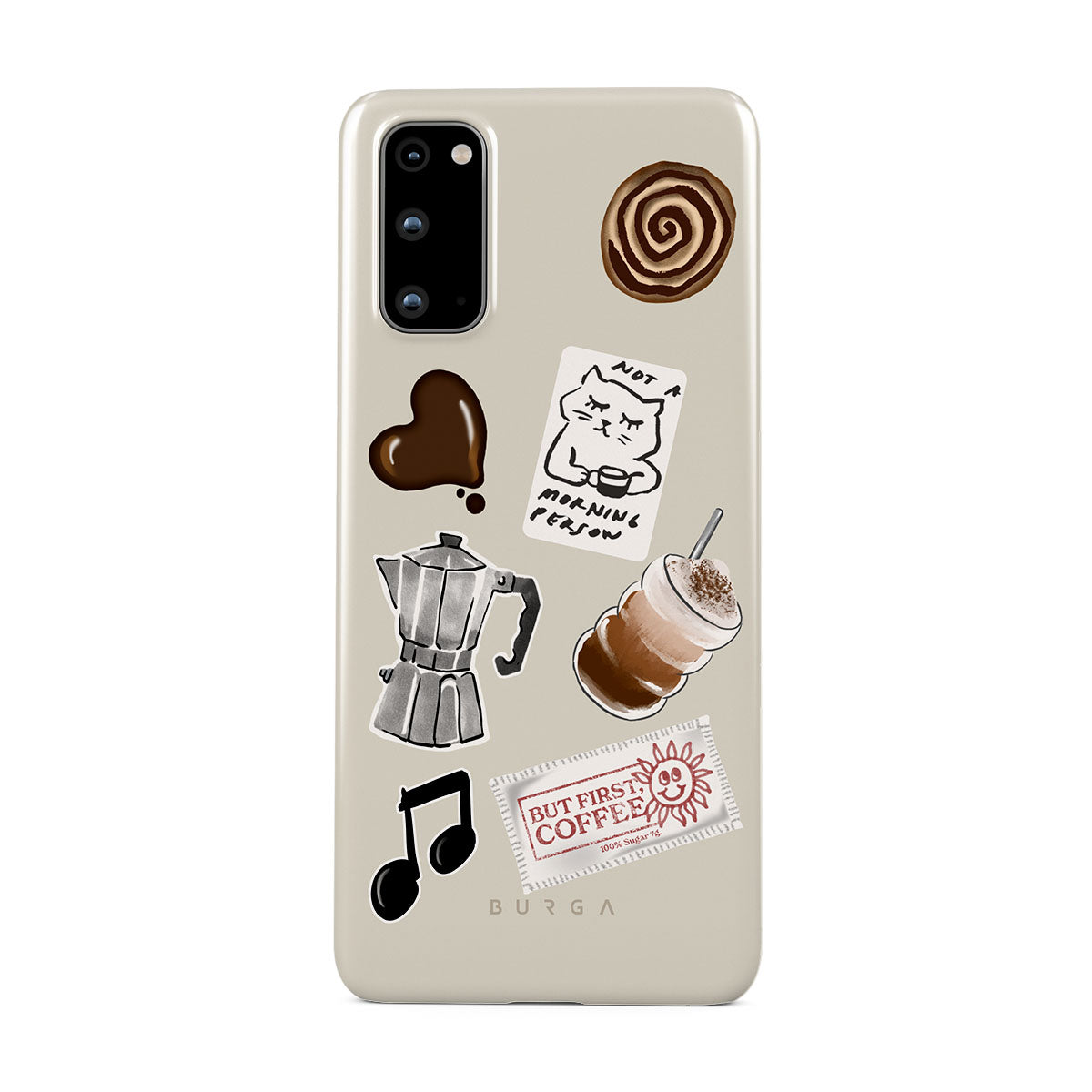 En este diseño: cafetera moka, frappé, rollo de canela, corazón de chocolate, sticker "Not a morning person", ticket "But First, Coffee", nota musical.