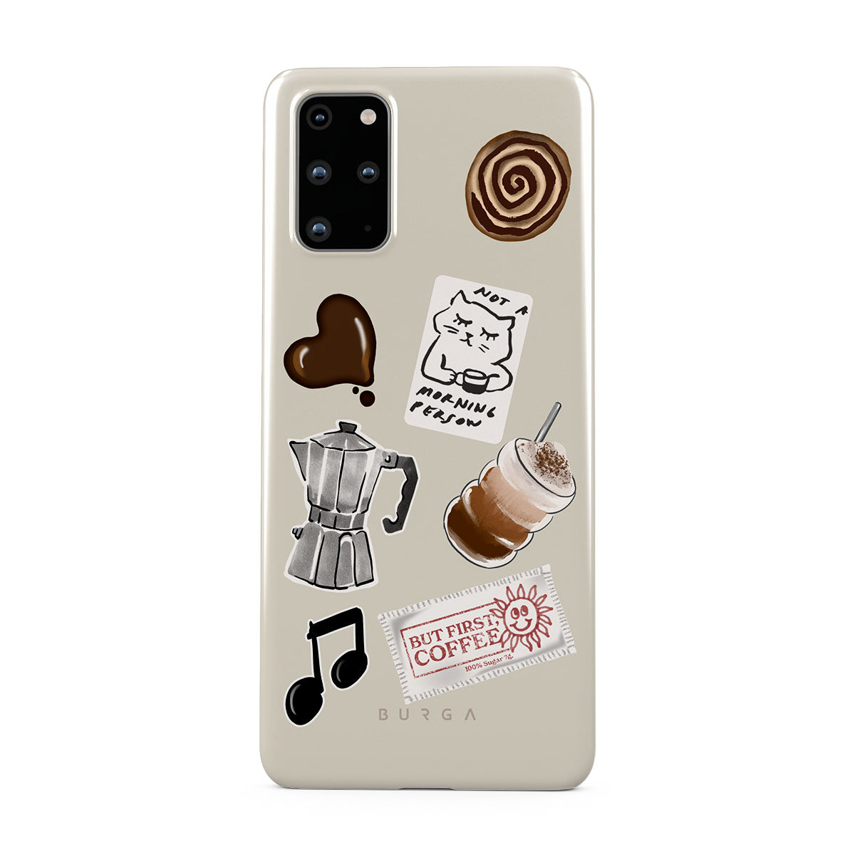 En este diseño: cafetera moka, frappé, rollo de canela, corazón de chocolate, sticker "Not a morning person", ticket "But First, Coffee", nota musical.