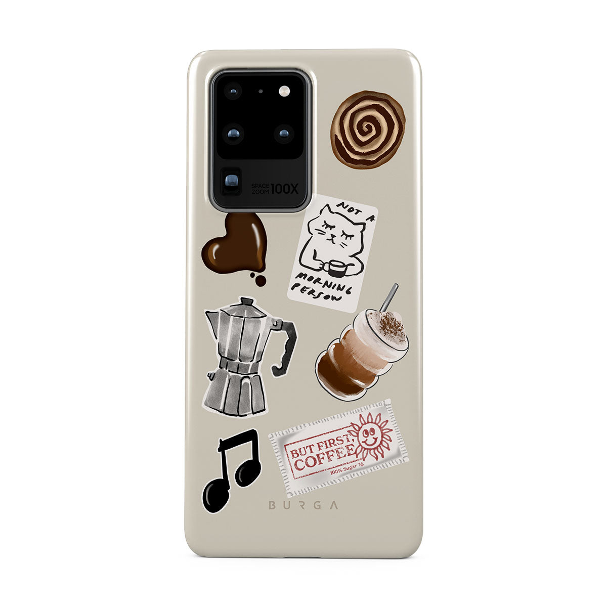 En este diseño: cafetera moka, frappé, rollo de canela, corazón de chocolate, sticker "Not a morning person", ticket "But First, Coffee", nota musical.