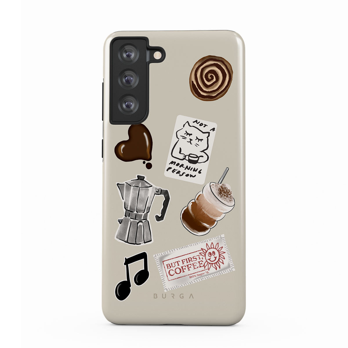 En este diseño: cafetera moka, frappé, rollo de canela, corazón de chocolate, sticker "Not a morning person", ticket "But First, Coffee", nota musical.